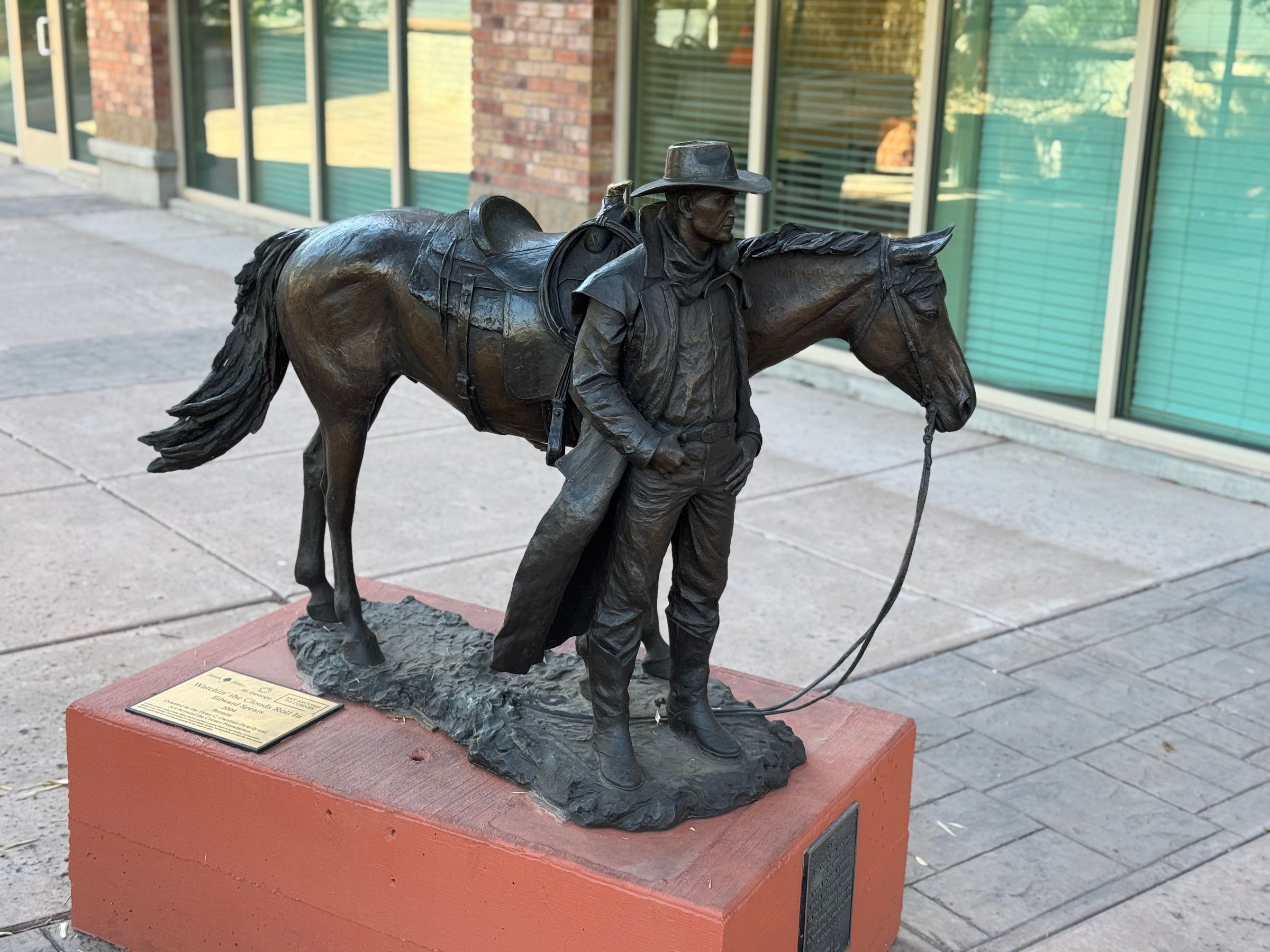 Bronze sculpture of a cowboy standing next to his horse looking into the sky.