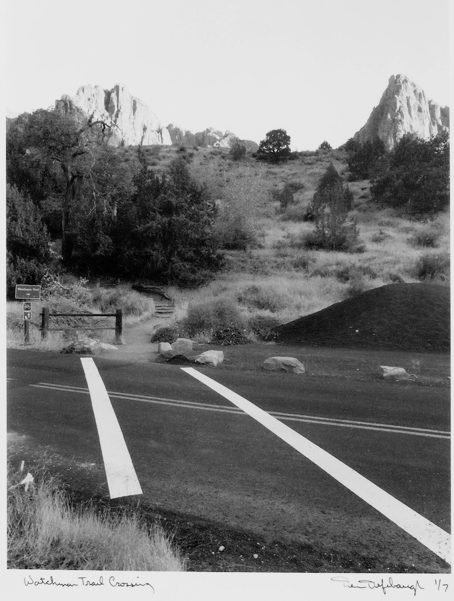 Photograph of crosswalk to the Watchman Trail with views of The Watchman and The Temples of the Virgin in the background. This is in the Watchman Campground area of Zion National ParkAcquisition
