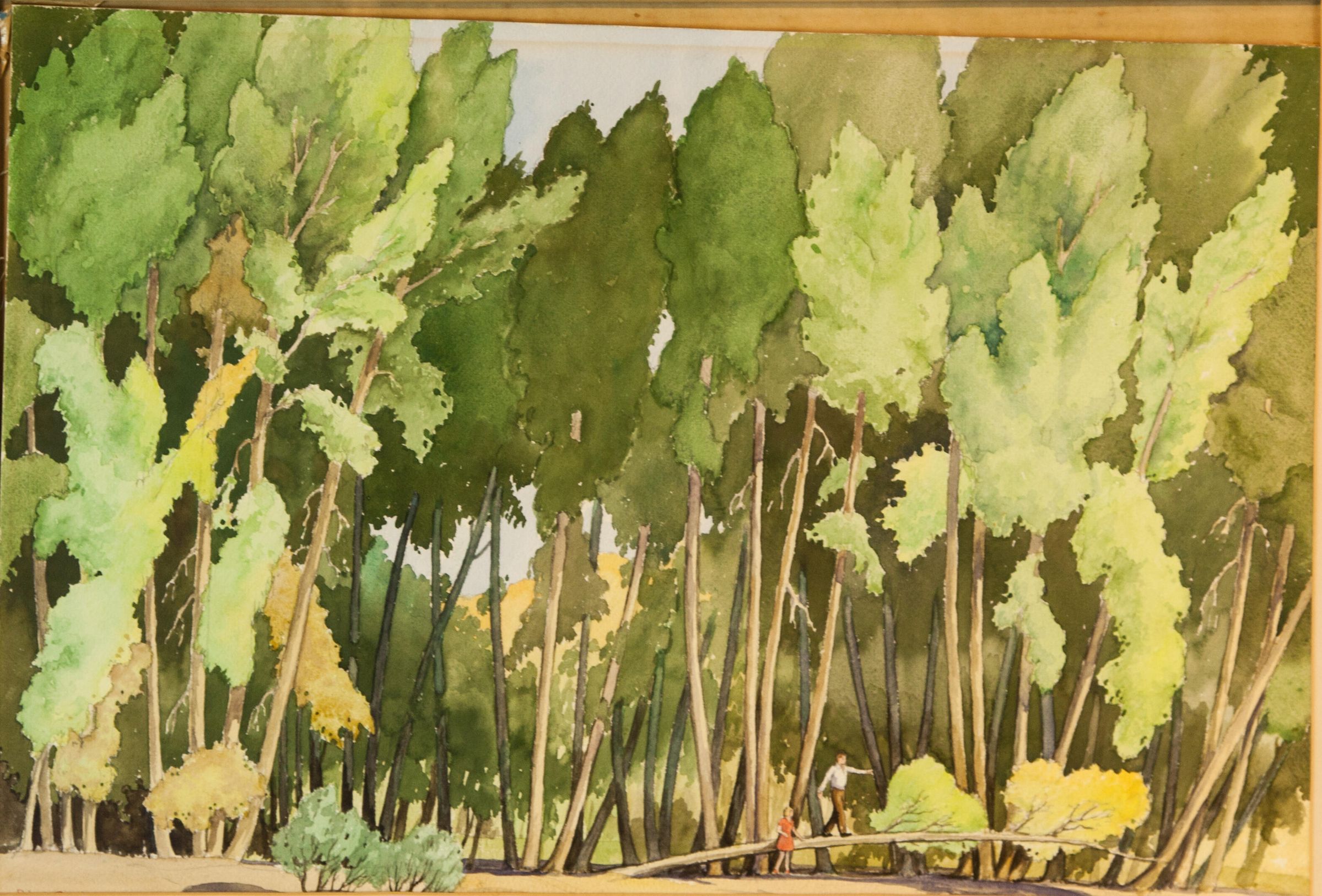 Watercolor on paper of a forest scene. Two people in right foreground, one is walking on the trunk of a fallen tree. Title is unknown.Acquisition
