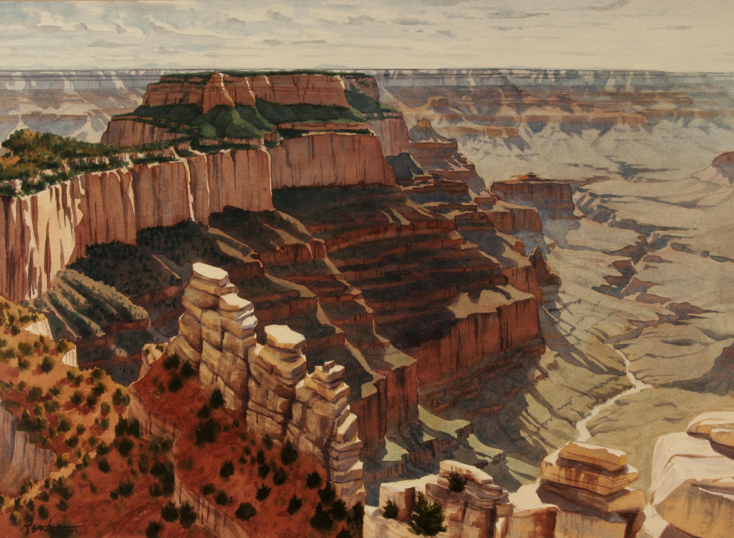 A view of the mammoth formation called Wotan's Throne in the Grand Canyon National Park. The Colorado River is visible in the right side of the painting.