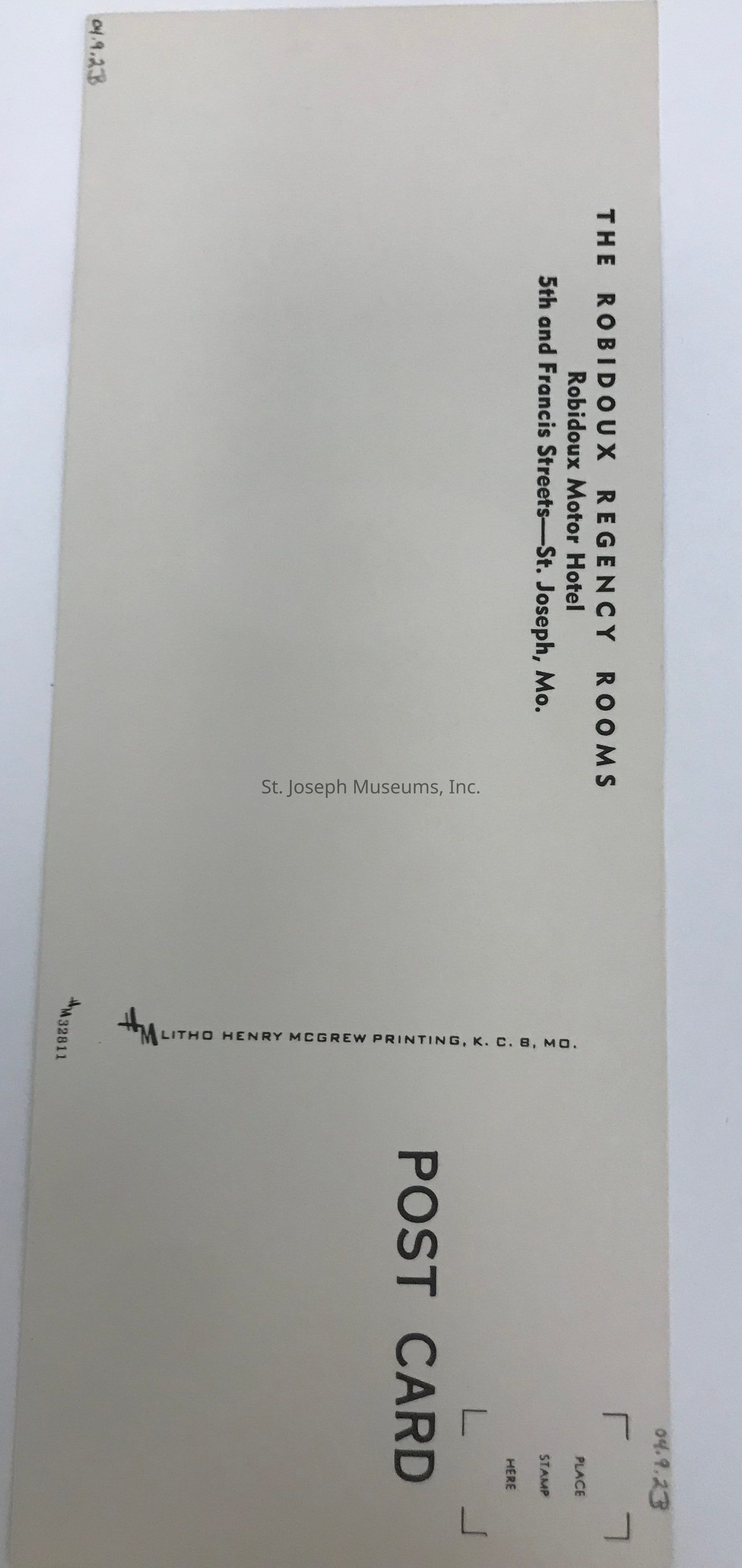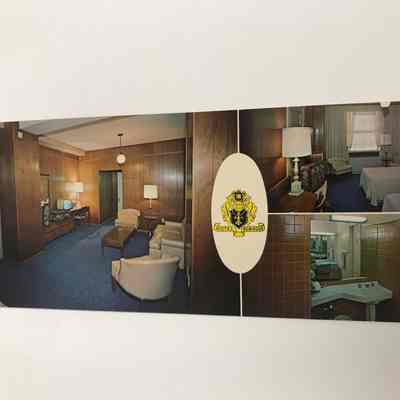 Color Postcard of the interior of a guest room at the Hotel Robidoux in St. Joseph, Missouri, c. 1950. Card includes photos of sitting area, bedroom, and bathroom. It includes the Robidoux logo on the postcard.Lexicon