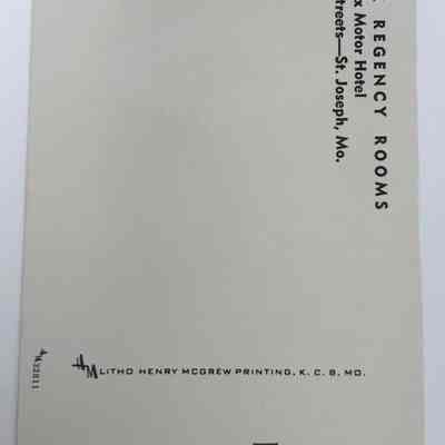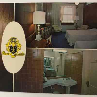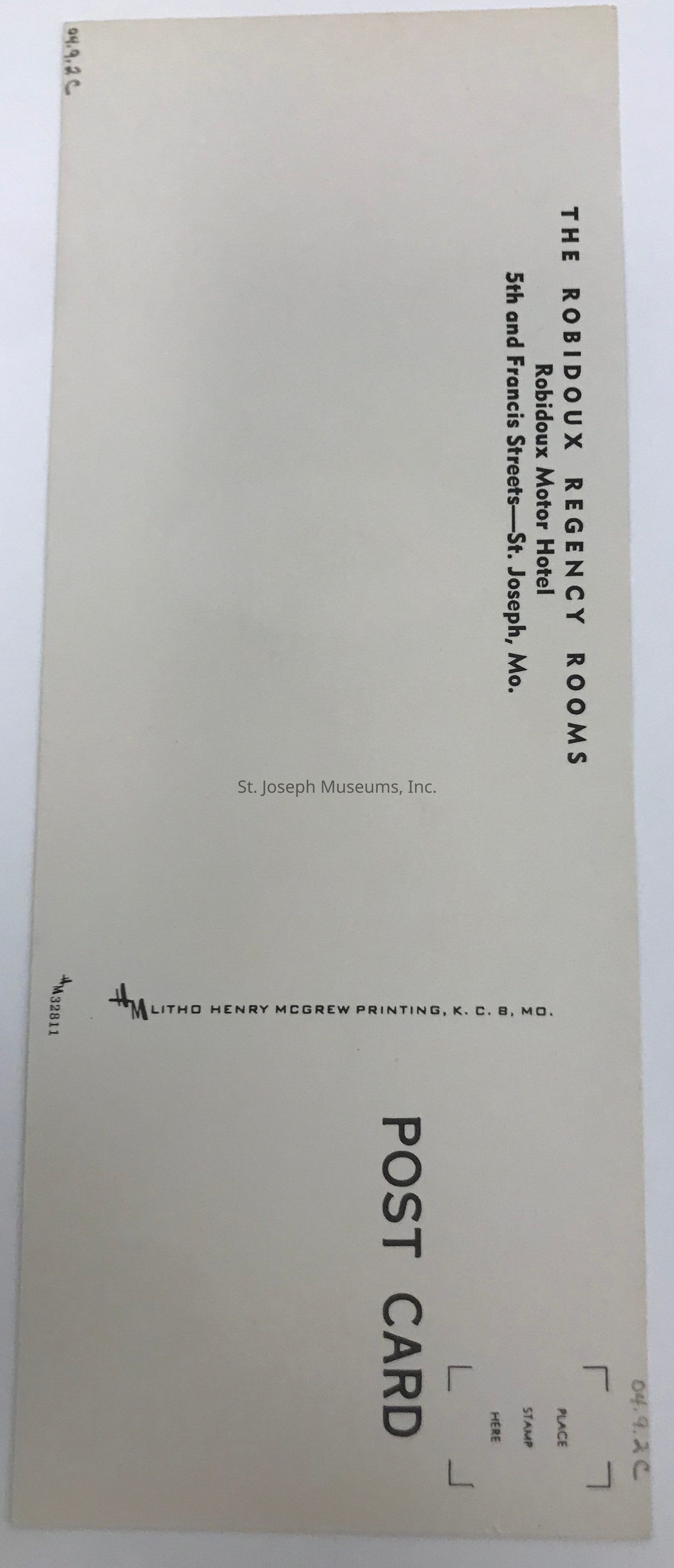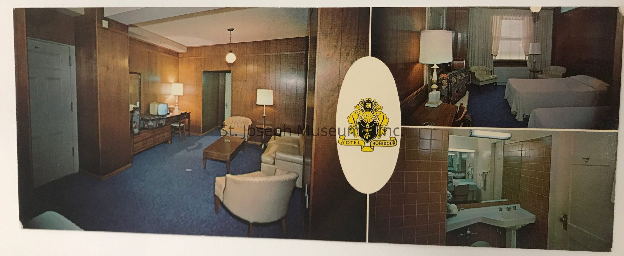 Color Postcard of the interior of a guest room at the Hotel Robidoux in St. Joseph, Missouri, c. 1950. Card includes photos of sitting area, bedroom, and bathroom. It includes the Robidoux logo on the postcard.