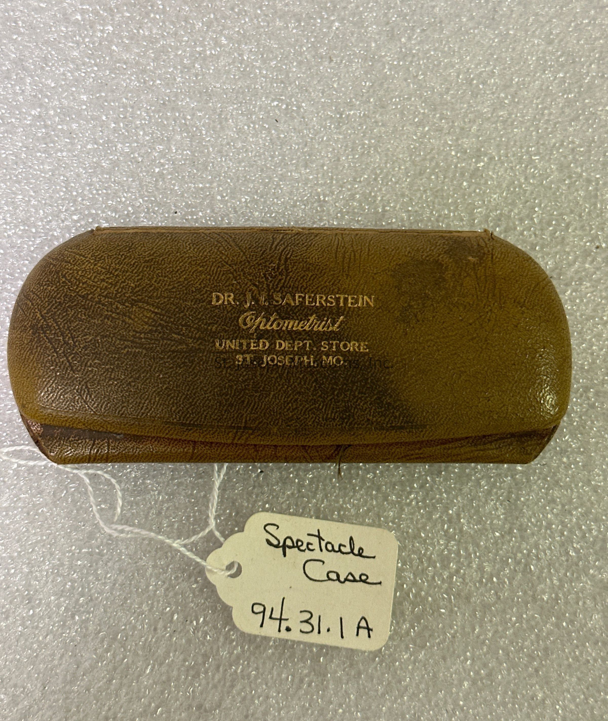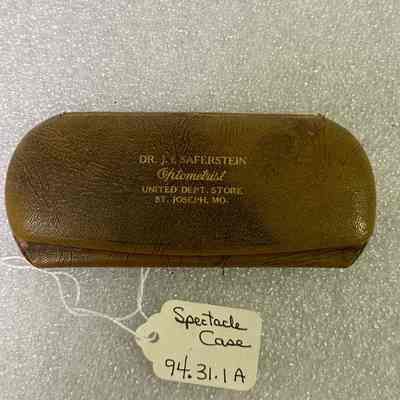Eye glasses case/gold color/"Dr. J.I. Saferstein Optometrist - United Dept. Store, St. Joseph, MO" in gold lettering on top front/green velvet liningCollection