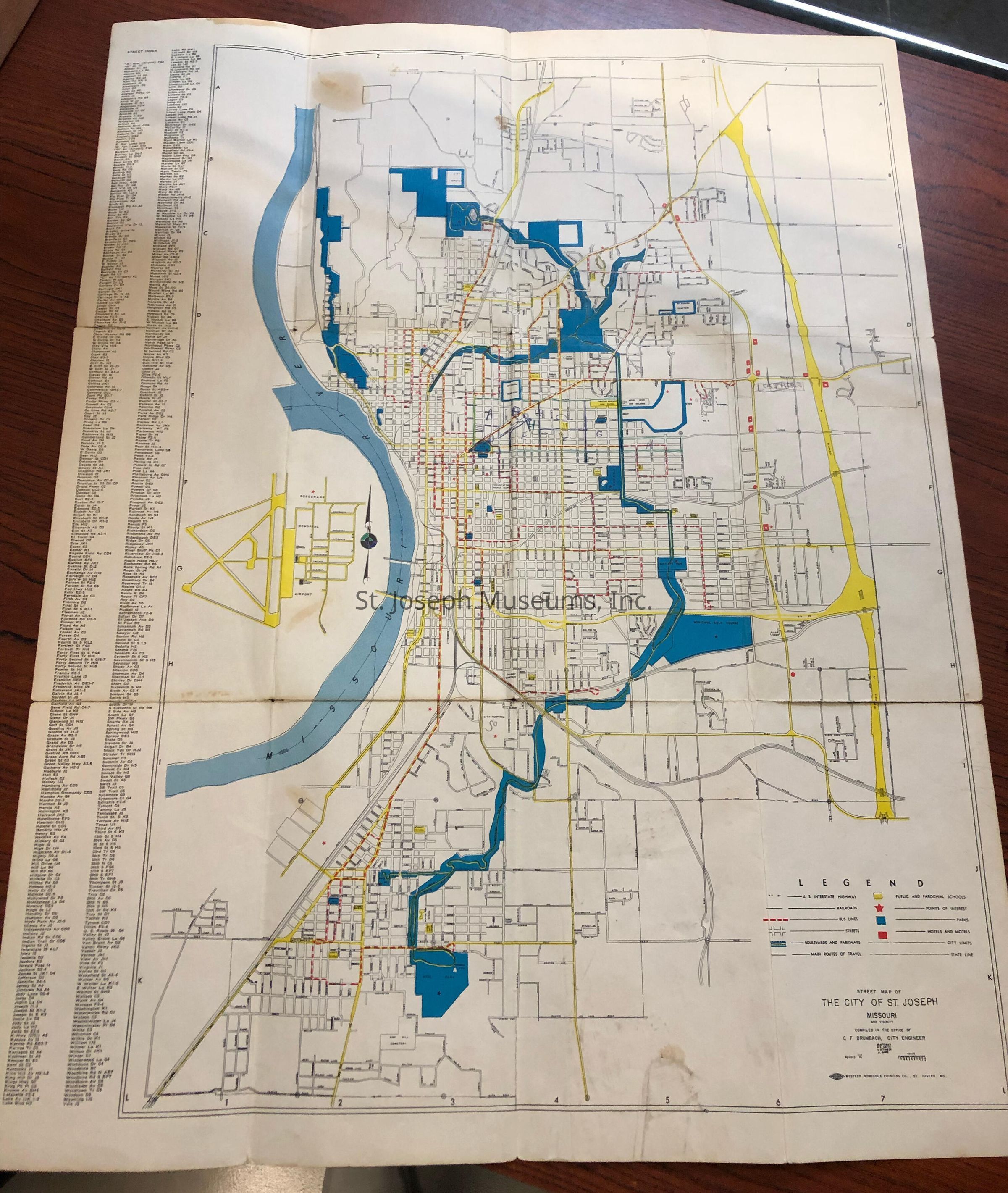 City of St. Joseph Street Map, c. 1960. undated but after 1952 flood and before City Auditorium torn down. Interstate highway shown but not East Hills Development. Compiled by C. F. Brumbach, City Engineer. Printed by Western Robidoux Printing CoCollection