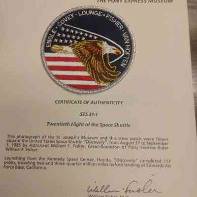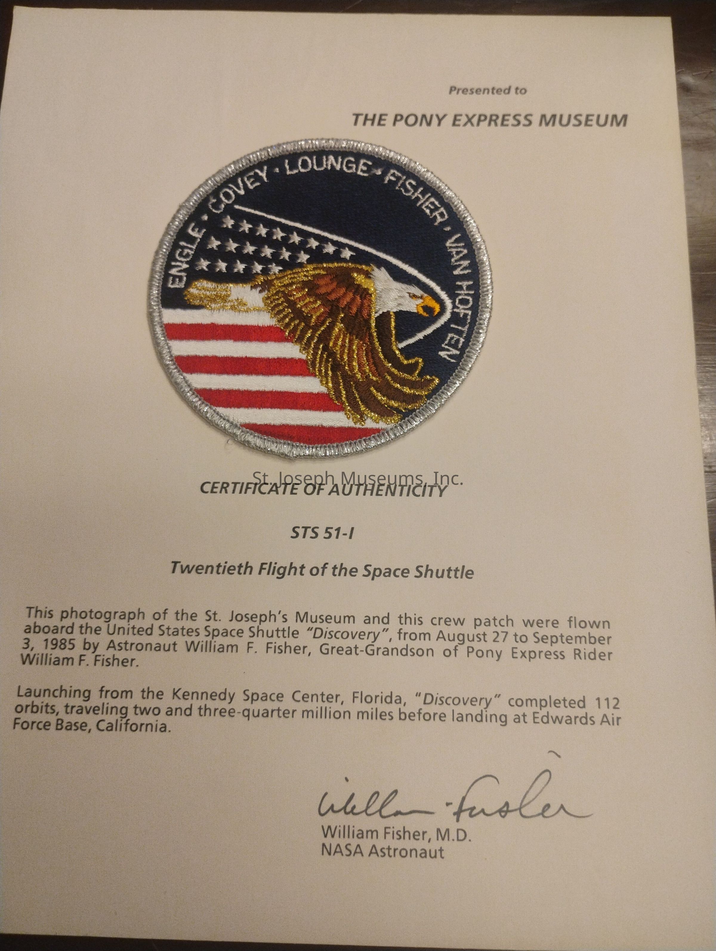 Space Shuttle Discovery Crew Patch & Certificate of Authenticity from flight that included a Photograph of the St. Joseph Museum, Aug. 27-Sept. 3, 1985. Embroidered crew patch 4" diameter, Engle-Covey-Lounge-Fisher-Van Hoften, with eagle in flight in front of stars and stripes. Presented to Pony Express Museum.