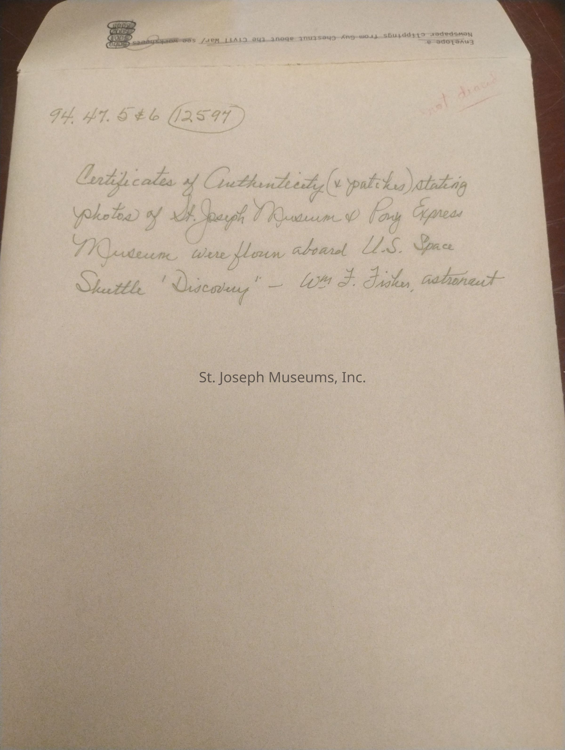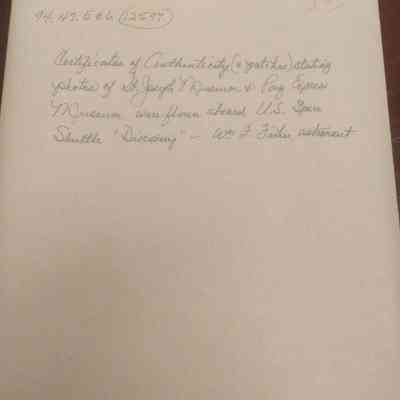 "This photograph of the St. Joseph Museum, and this crew patch were flown aboard the United States Space Shuottle "Discovery", from August 27 to September 3, 1985 by Astronaut William F. Fisher, Great-Grandson of Pony Express Rider William F. Fisher.