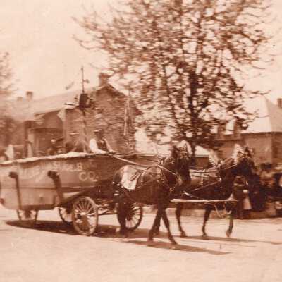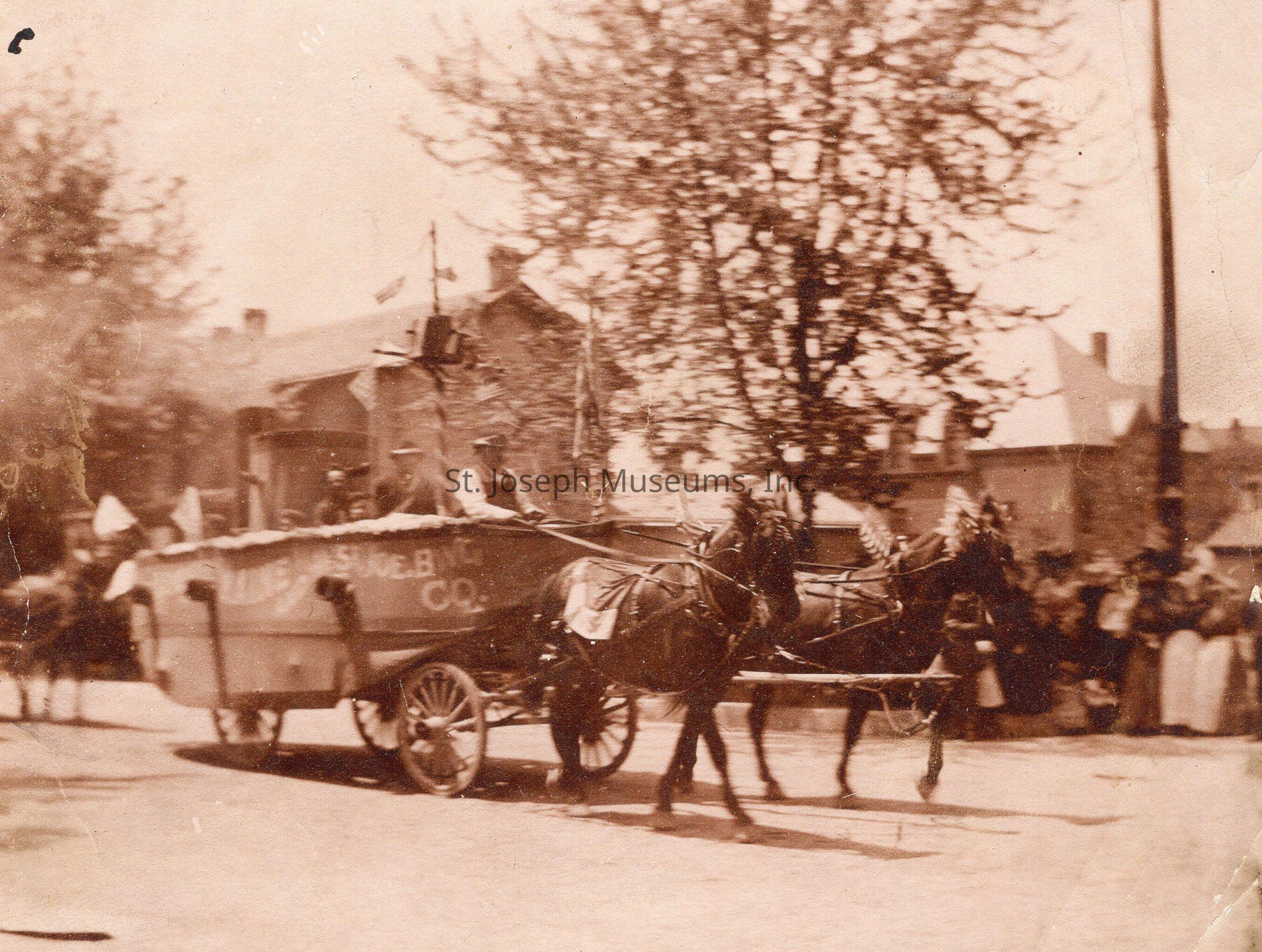 Parade Tub Unit Photo, c. 1900. sepia. Giant "bath" tub pulled by mules in parade. People riding inside, spectators on sidewalk behind. Name of company is written on side but illegible although "Joe" is distinct. May be same parade as 2018.2.128.Collection