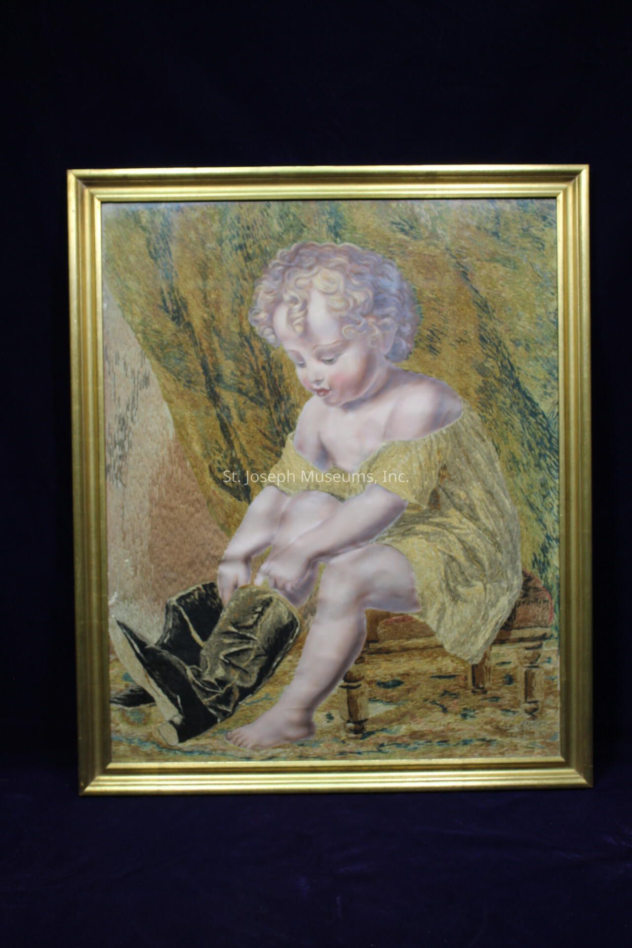 TAPESTRY BACKGROUND WITH PAINTED CHILD/DONE BY JOSEPHINE ANGELIQUE ROUBIDOUX IN 1859 WHILE SHE WAS AT SACRED HEART CONVENT/FRAMED/