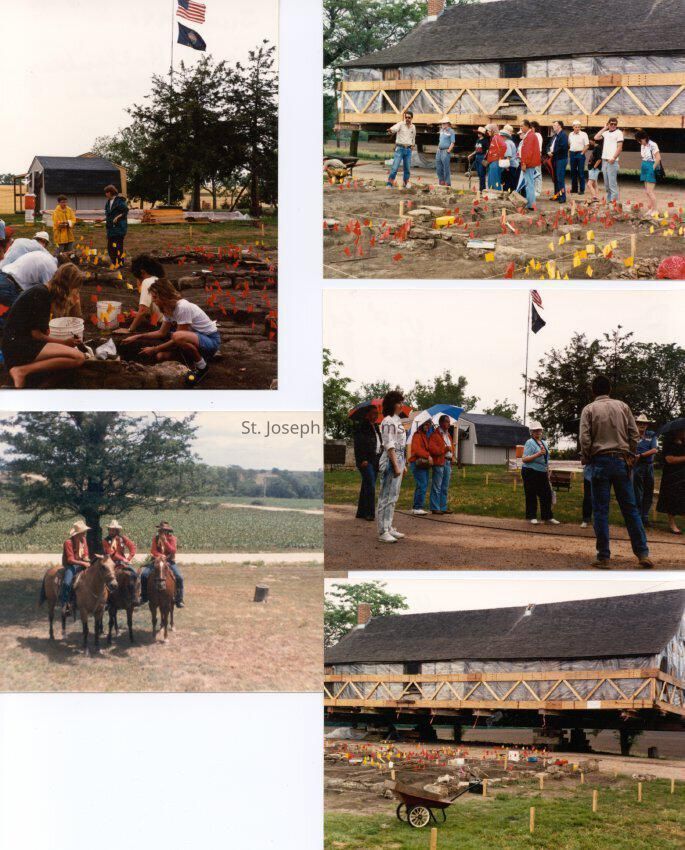 Hollenberg (Cottonwood) Pony Express Station Dig, June, 1991. 4 color snapshots of Dig at Hollenberg. The Station was jacked up and moved out of the way, while volunteers searched for artifacts. Glenda Leimbach, a SJM volunteer participated and took these photos.