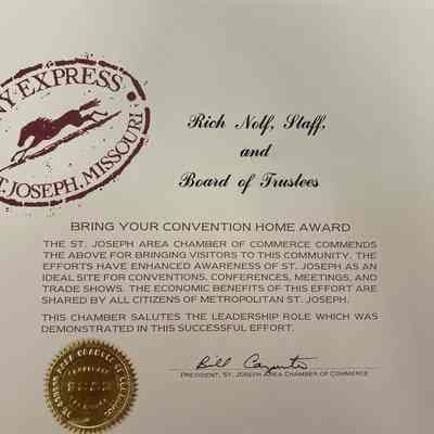 Commendation Certificate to Rich Nolf, Museum Director, & St. Joseph Museum Board for bring the national Oregon-California Trails Association Convention to St. Joseph in August, 1988; presented by St. Joseph, Missouri Chamber of Commerce.