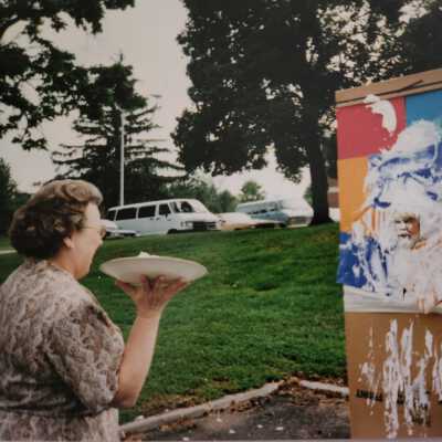 State Hospital Staff Photo of Pie Throwing at Carnival, 1995. Vernalee Carter (Dr. Dittemore's Secretary) throwing a pie at Dr. Dittemore at the carnival.