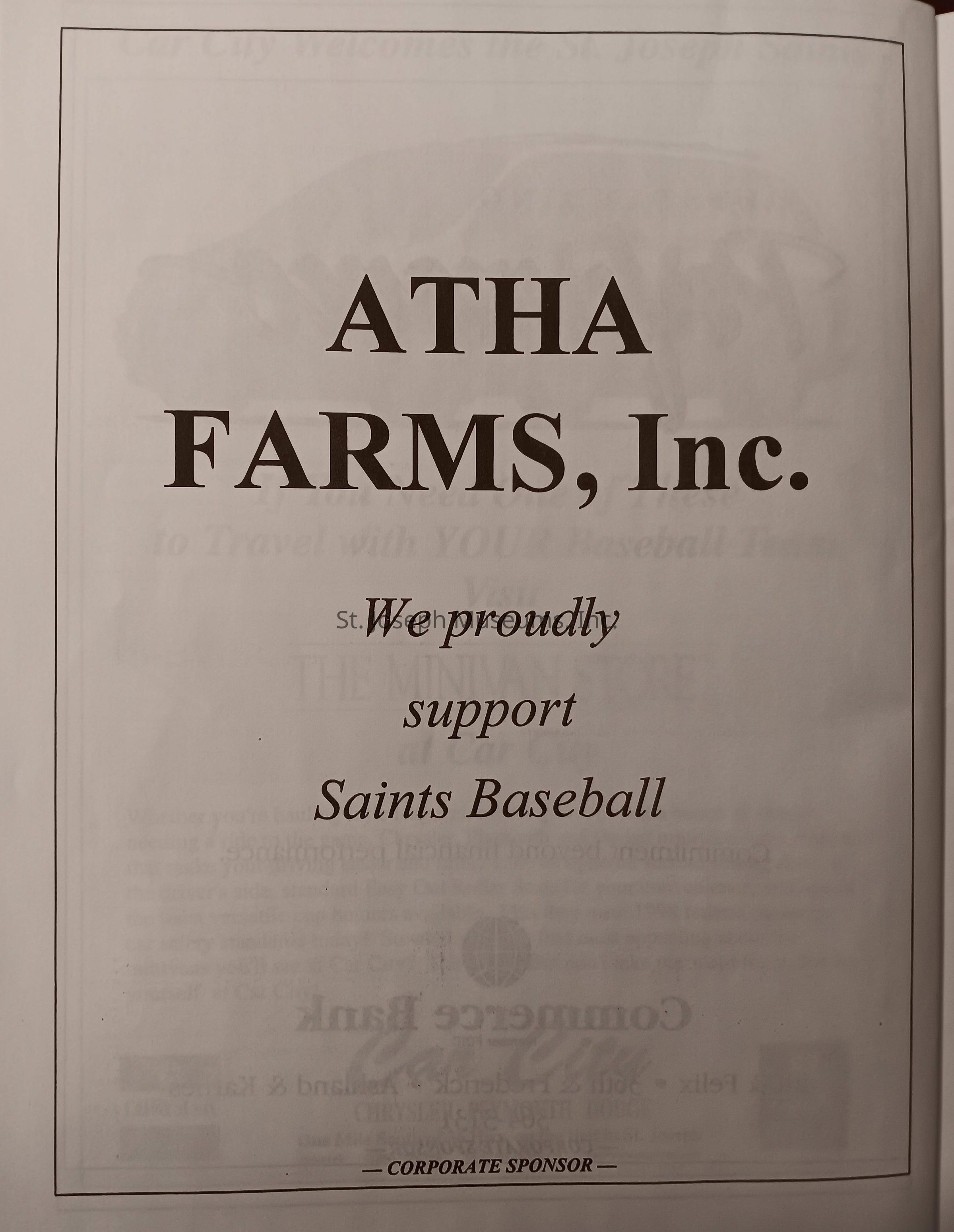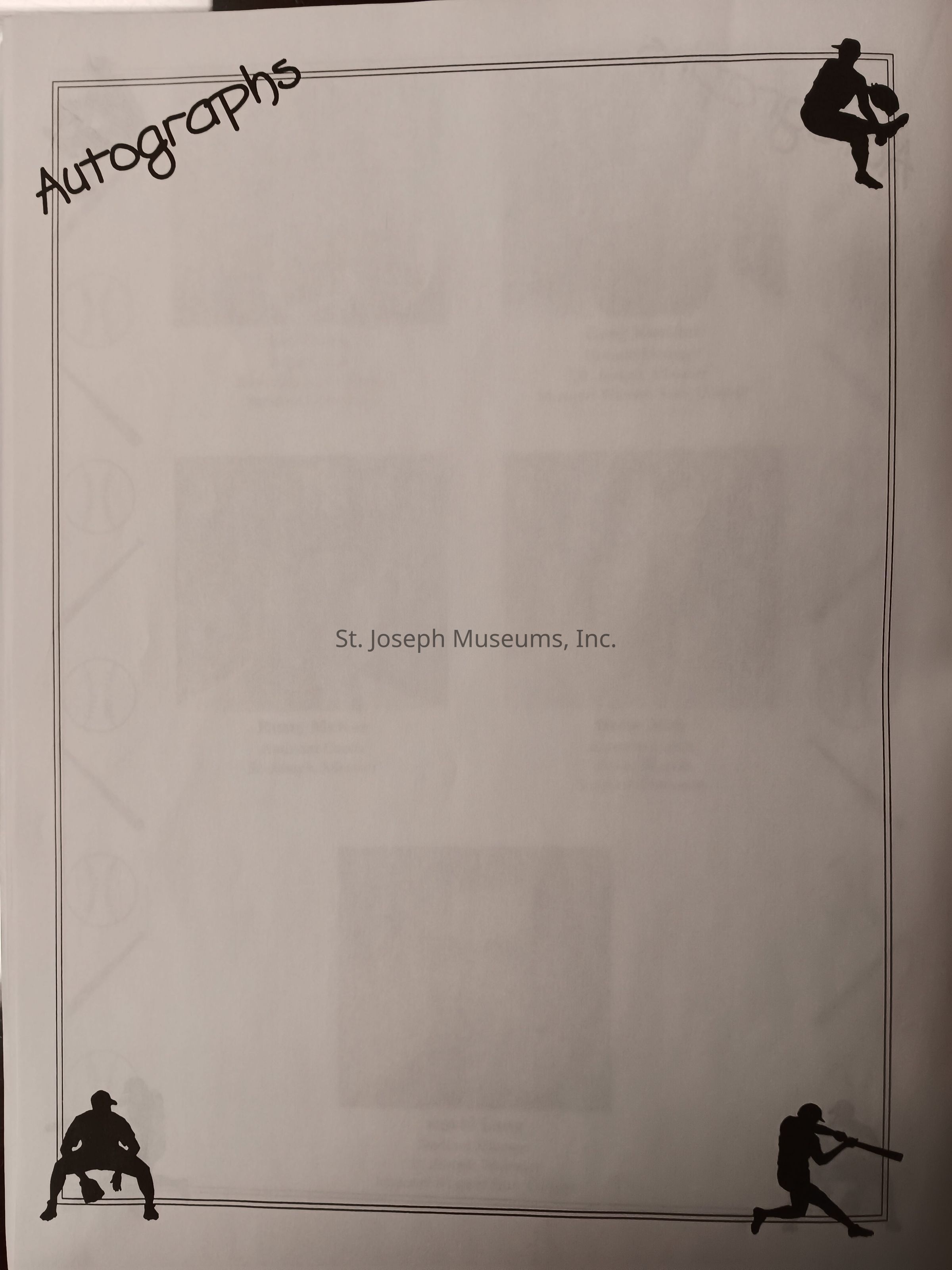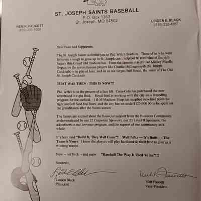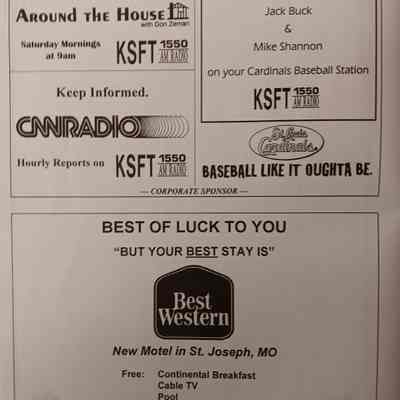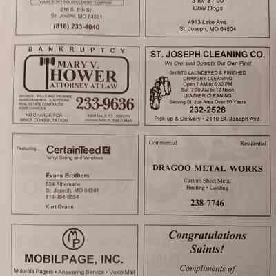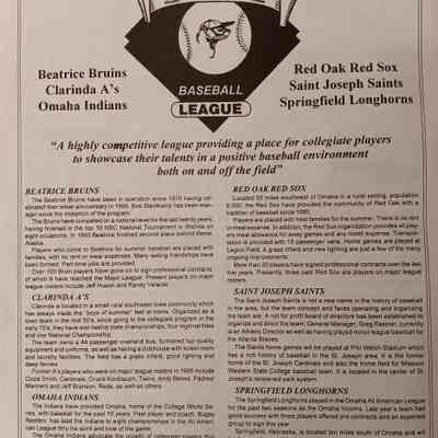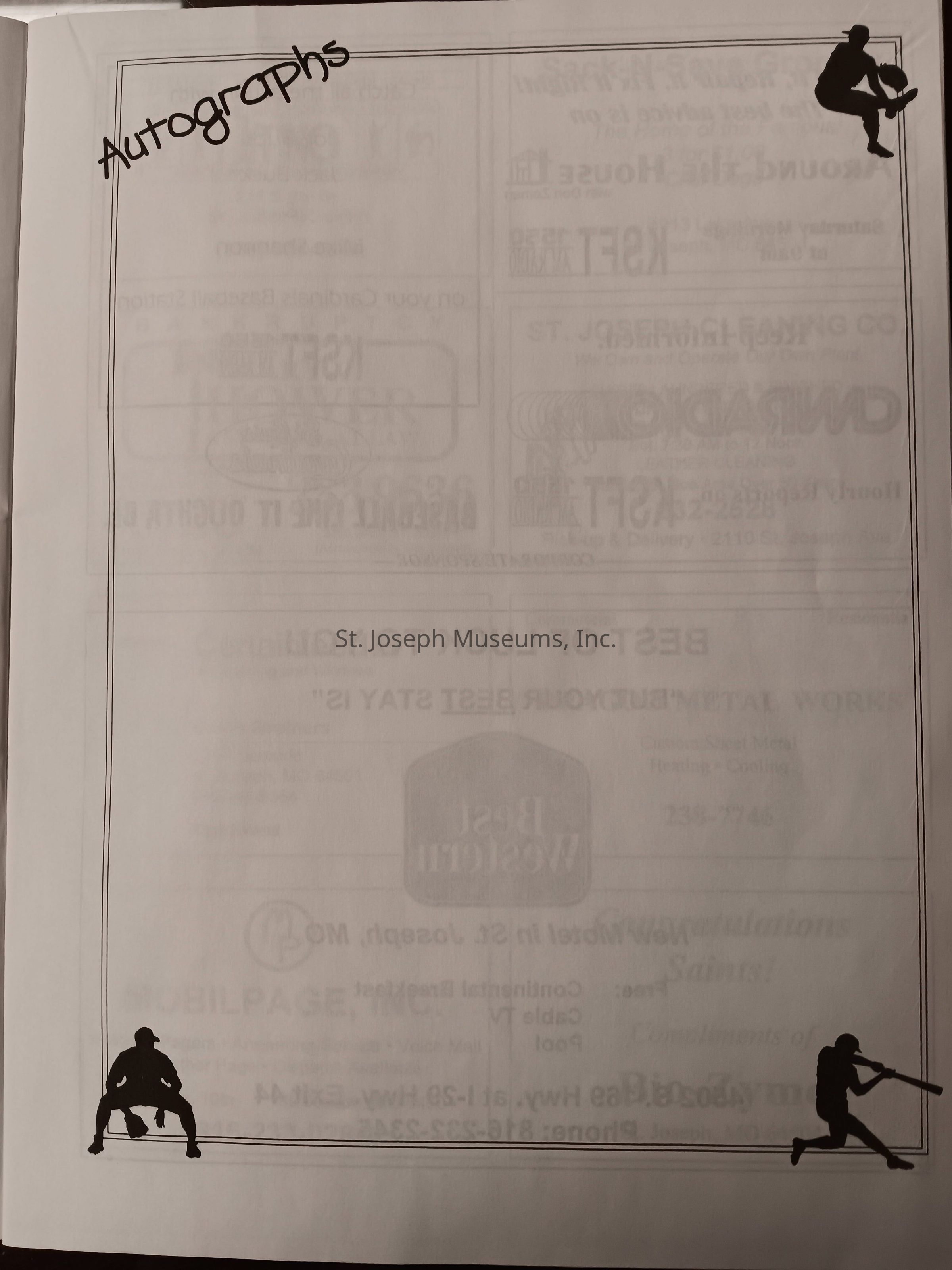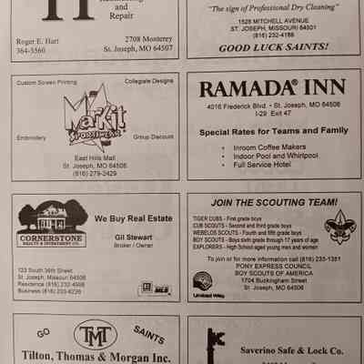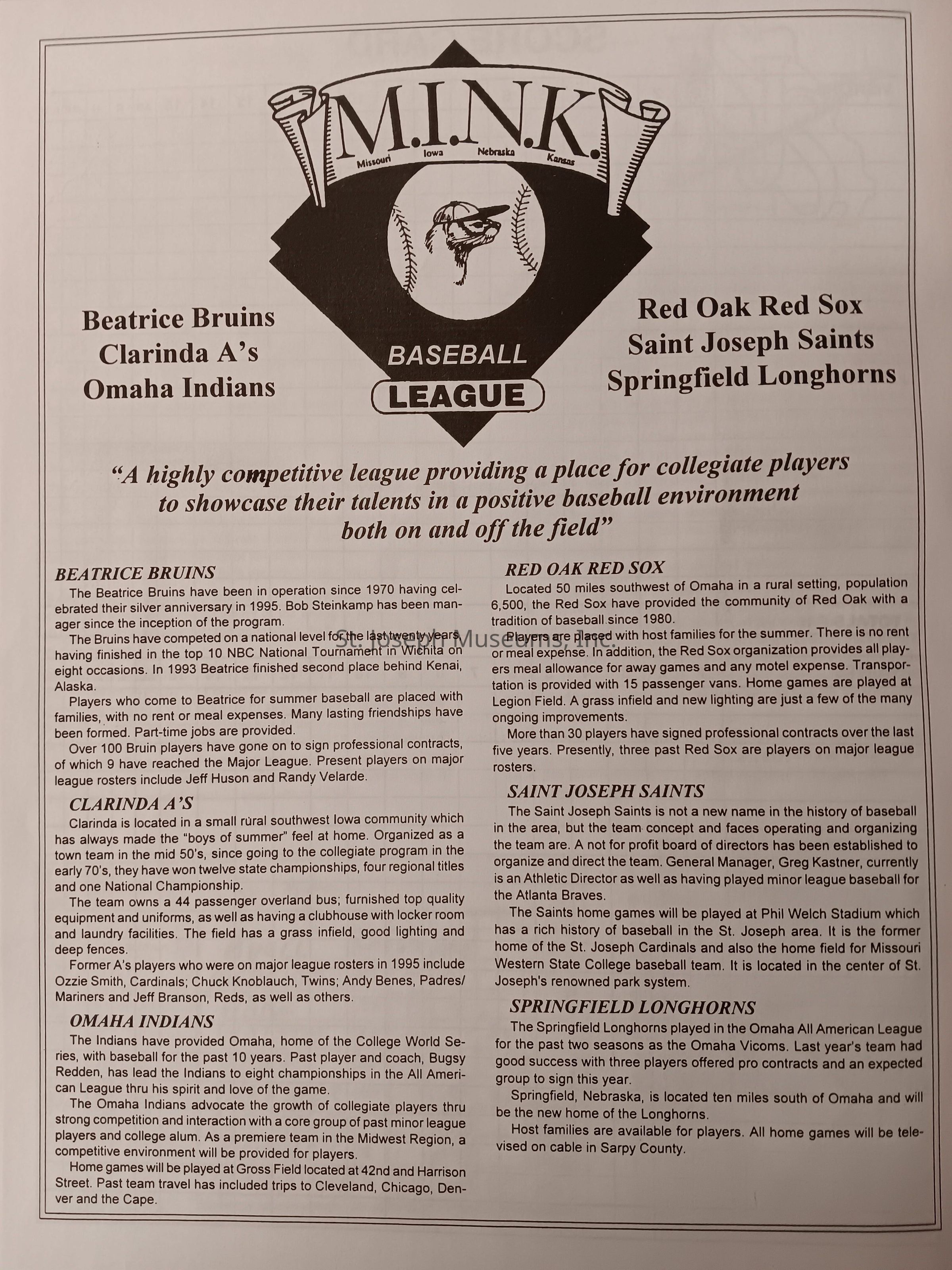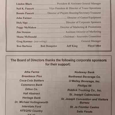 There was no Table of Contents nor page numbers in the first magazine. This being the inaugural edition it contains letters from the newly formed St. Joseph Saints Baseball President, and welcome letters from the City of St. Joseph and the Convention and Visitors Bureau. The first issue lists the Board of Directors and the M.I.N.K. (Missouri, Iowa, Nebraska, and Kansas) Baseball League teams. There are several pages devoted to photos of the players, coaches, and staff as well as space for autographs. The remainder of the issue contains advertisers and Corporate Sponsors.Lexicon