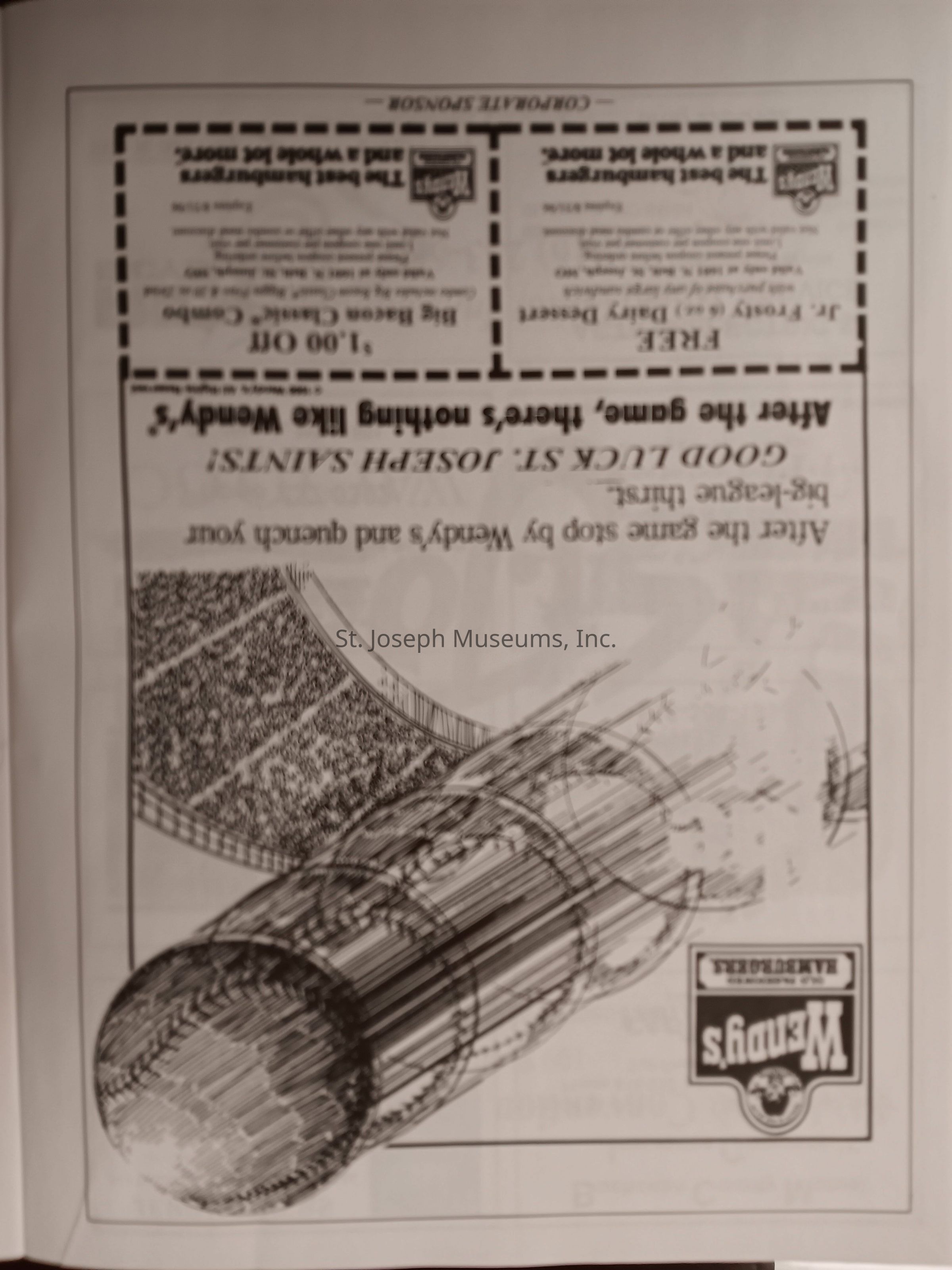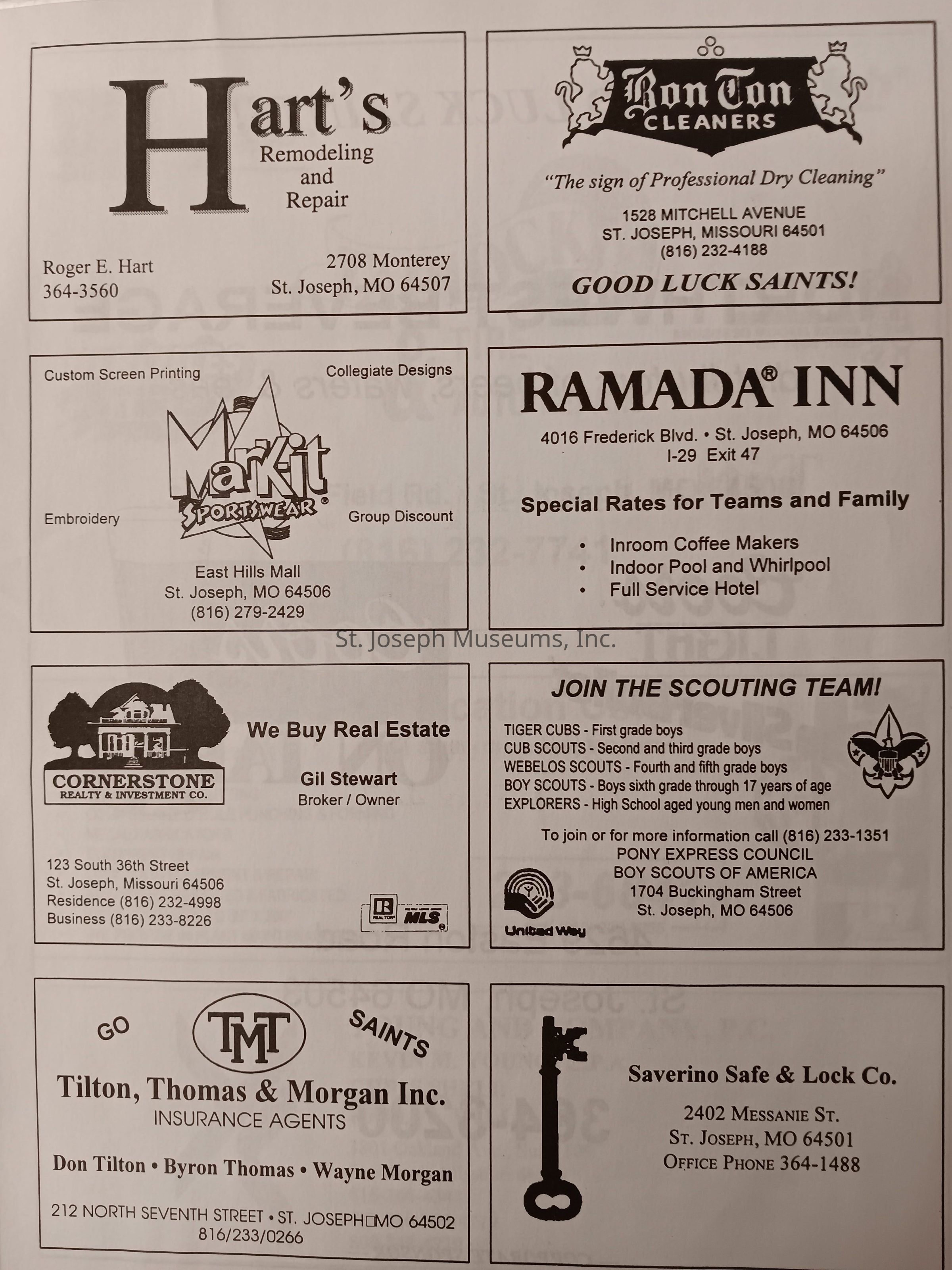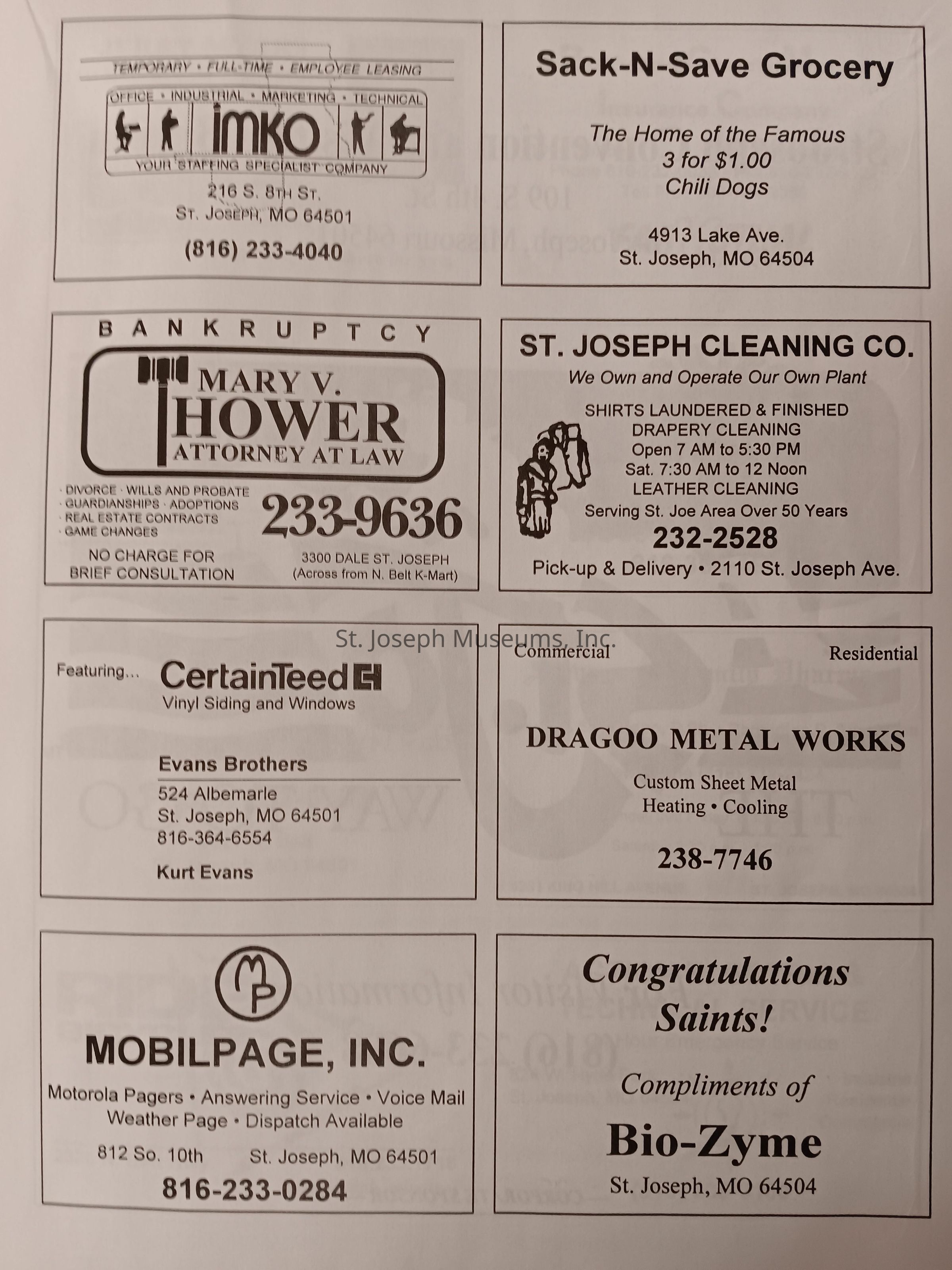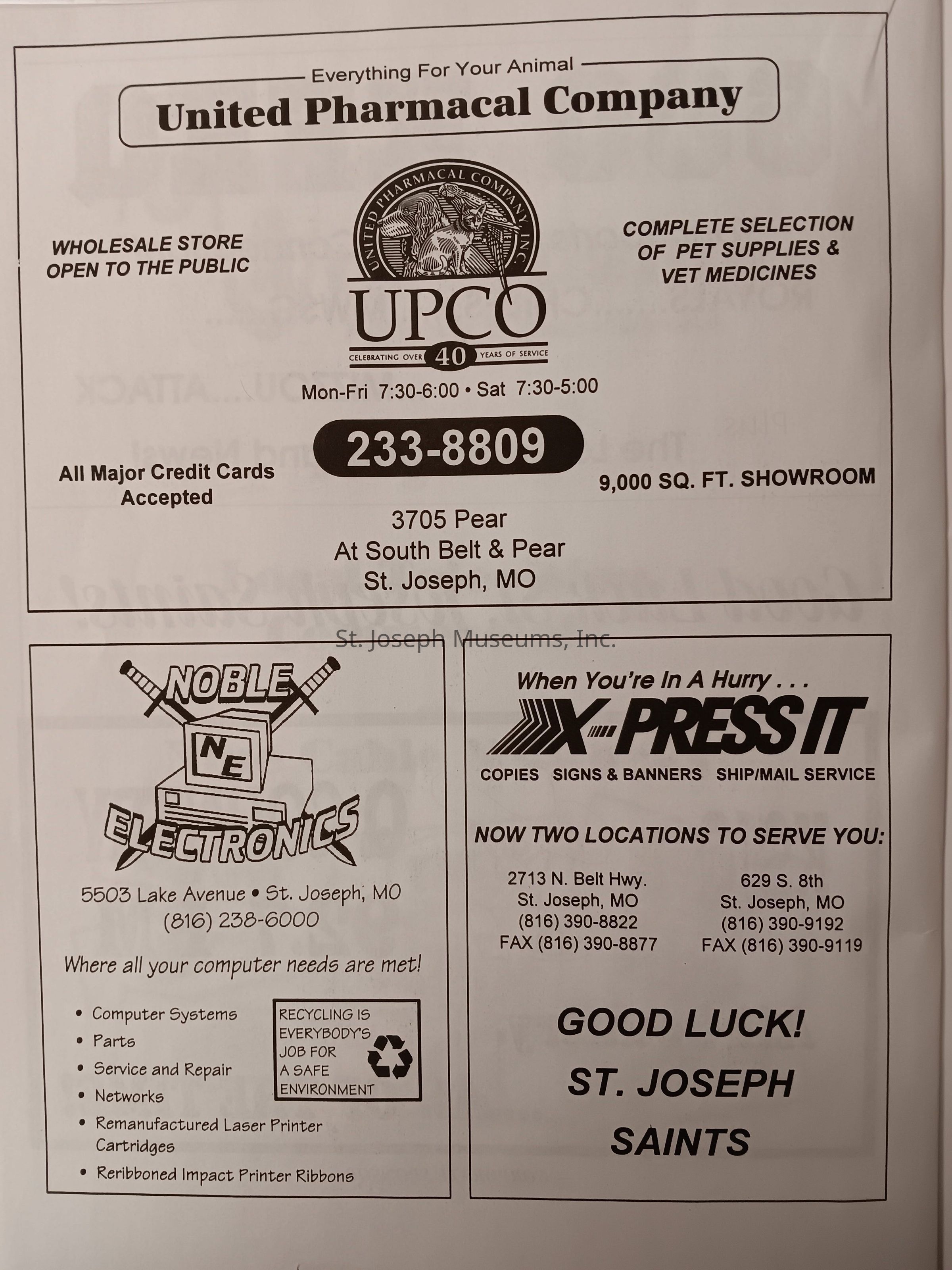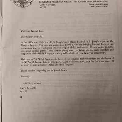 There was no Table of Contents nor page numbers in the first magazine. This being the inaugural edition it contains letters from the newly formed St. Joseph Saints Baseball President, and welcome letters from the City of St. Joseph and the Convention and Visitors Bureau. The first issue lists the Board of Directors and the M.I.N.K. (Missouri, Iowa, Nebraska, and Kansas) Baseball League teams. There are several pages devoted to photos of the players, coaches, and staff as well as space for autographs. The remainder of the issue contains advertisers and Corporate Sponsors.Lexicon