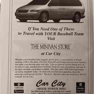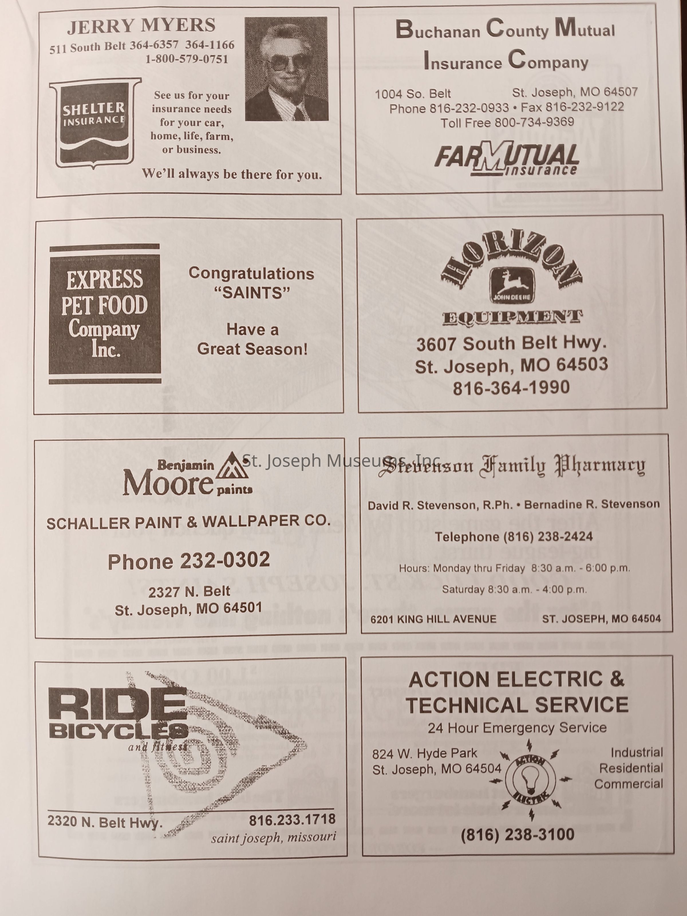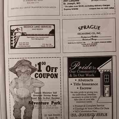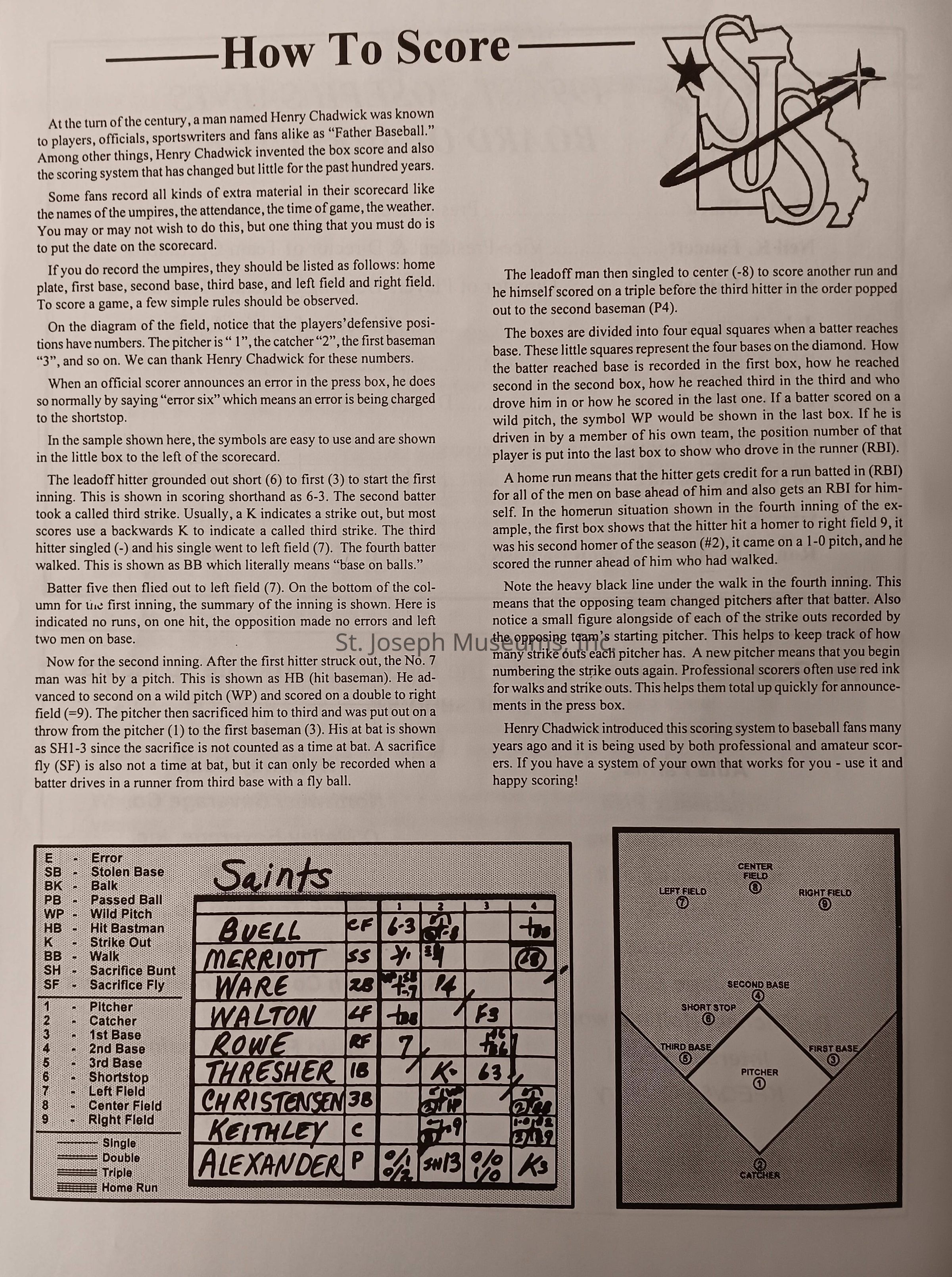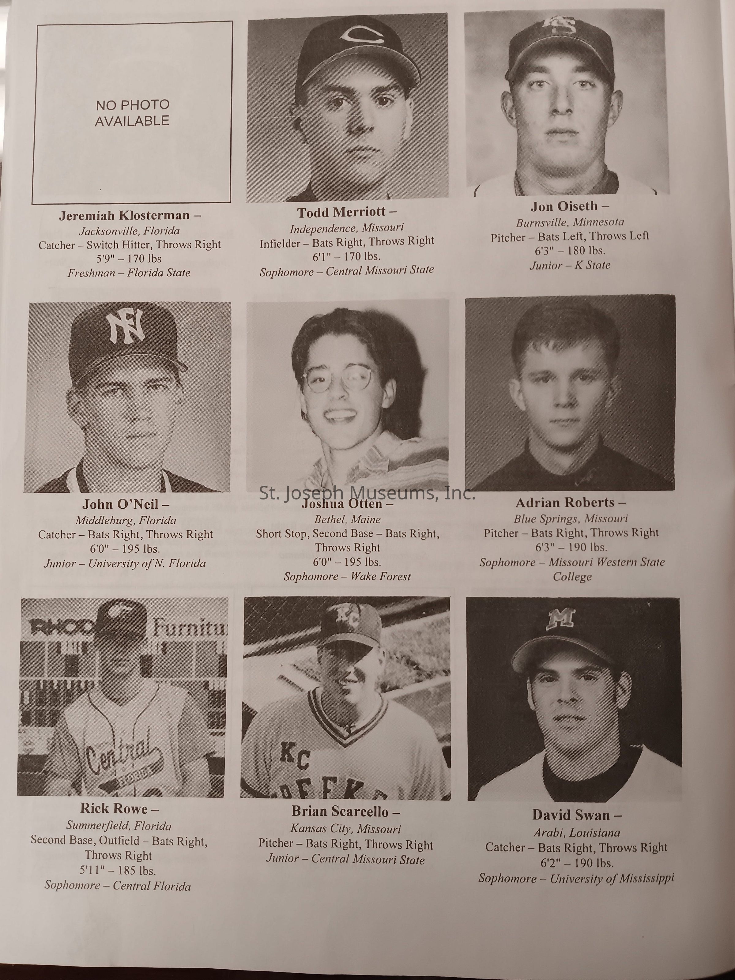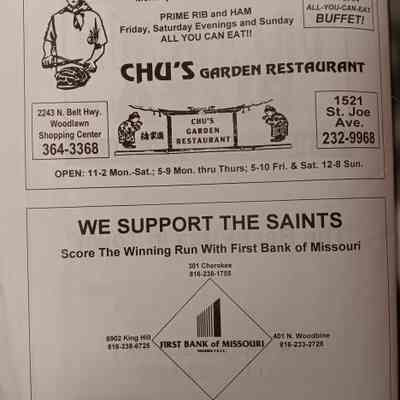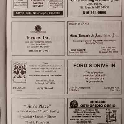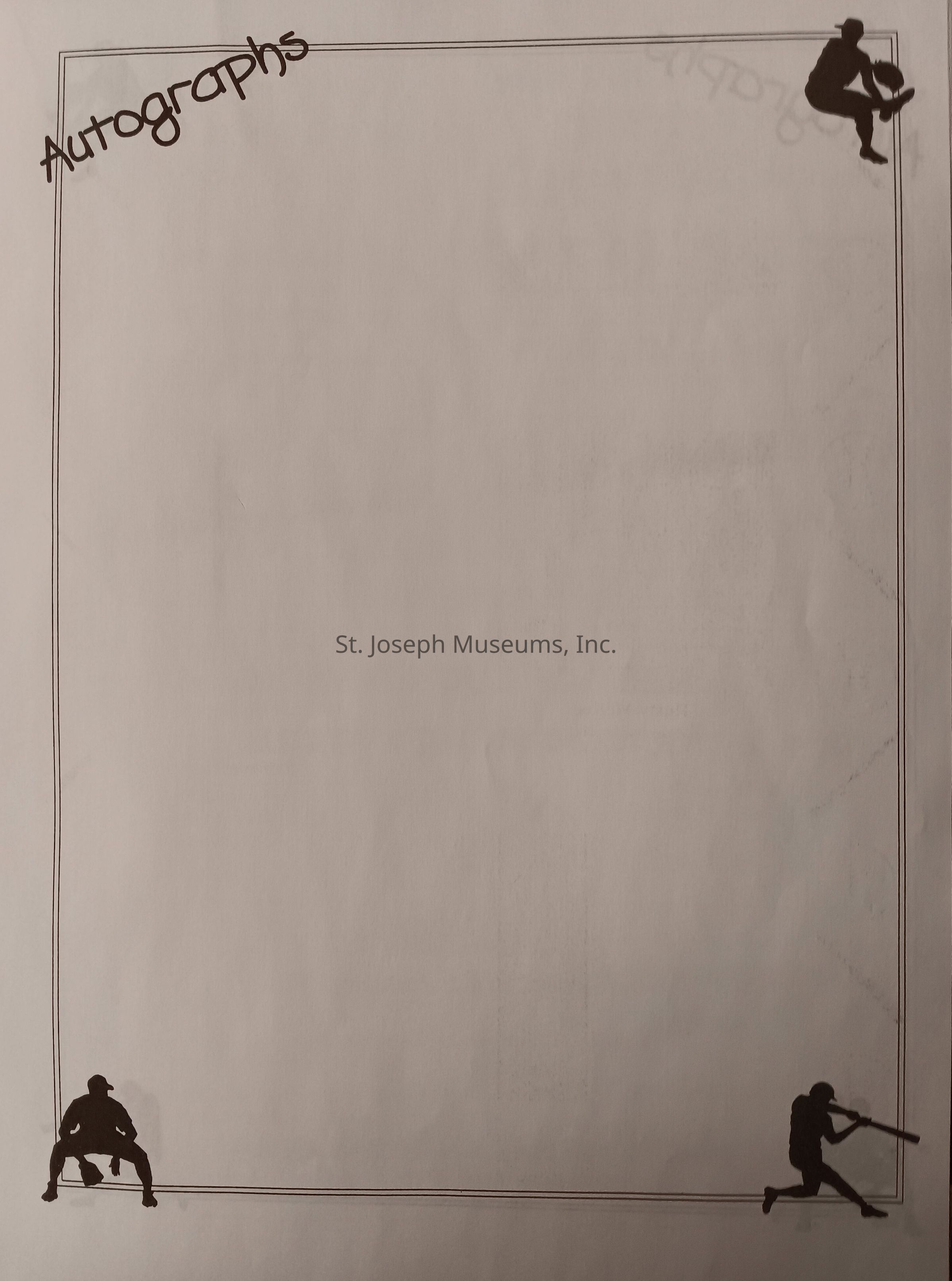 There was no Table of Contents nor page numbers in the first magazine. This being the inaugural edition it contains letters from the newly formed St. Joseph Saints Baseball President, and welcome letters from the City of St. Joseph and the Convention and Visitors Bureau. The first issue lists the Board of Directors and the M.I.N.K. (Missouri, Iowa, Nebraska, and Kansas) Baseball League teams. There are several pages devoted to photos of the players, coaches, and staff as well as space for autographs. The remainder of the issue contains advertisers and Corporate Sponsors.Lexicon