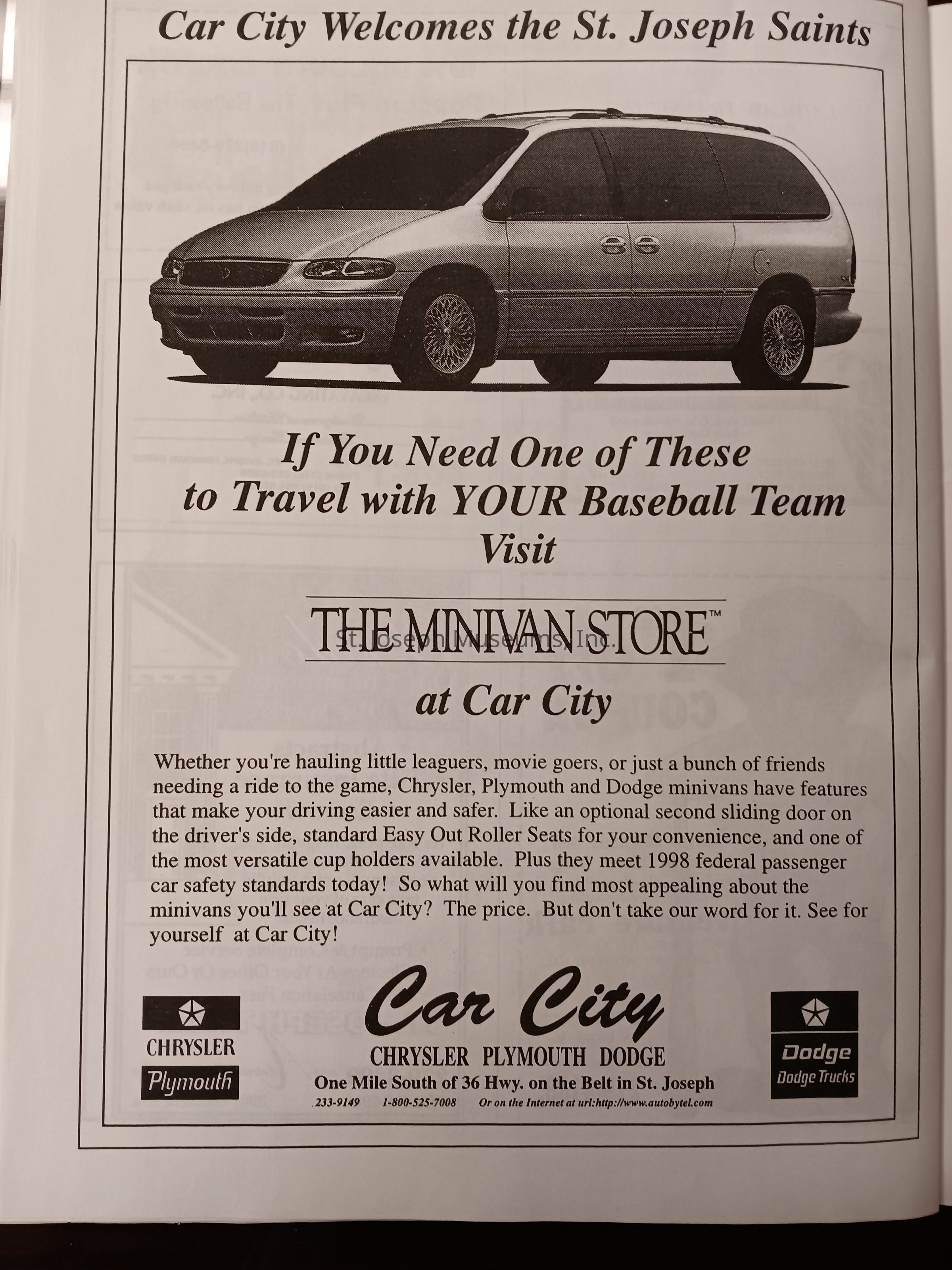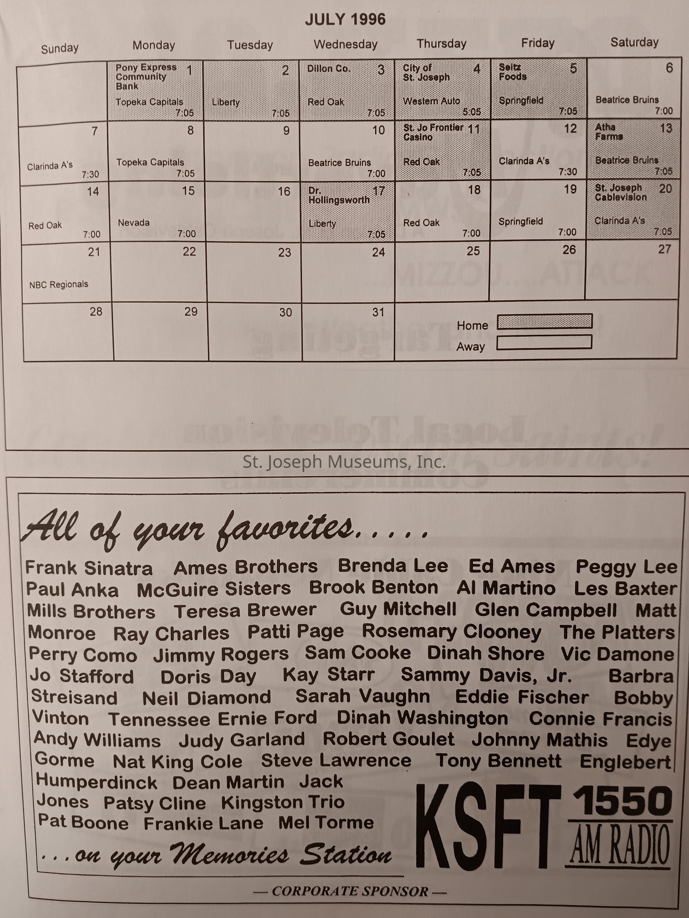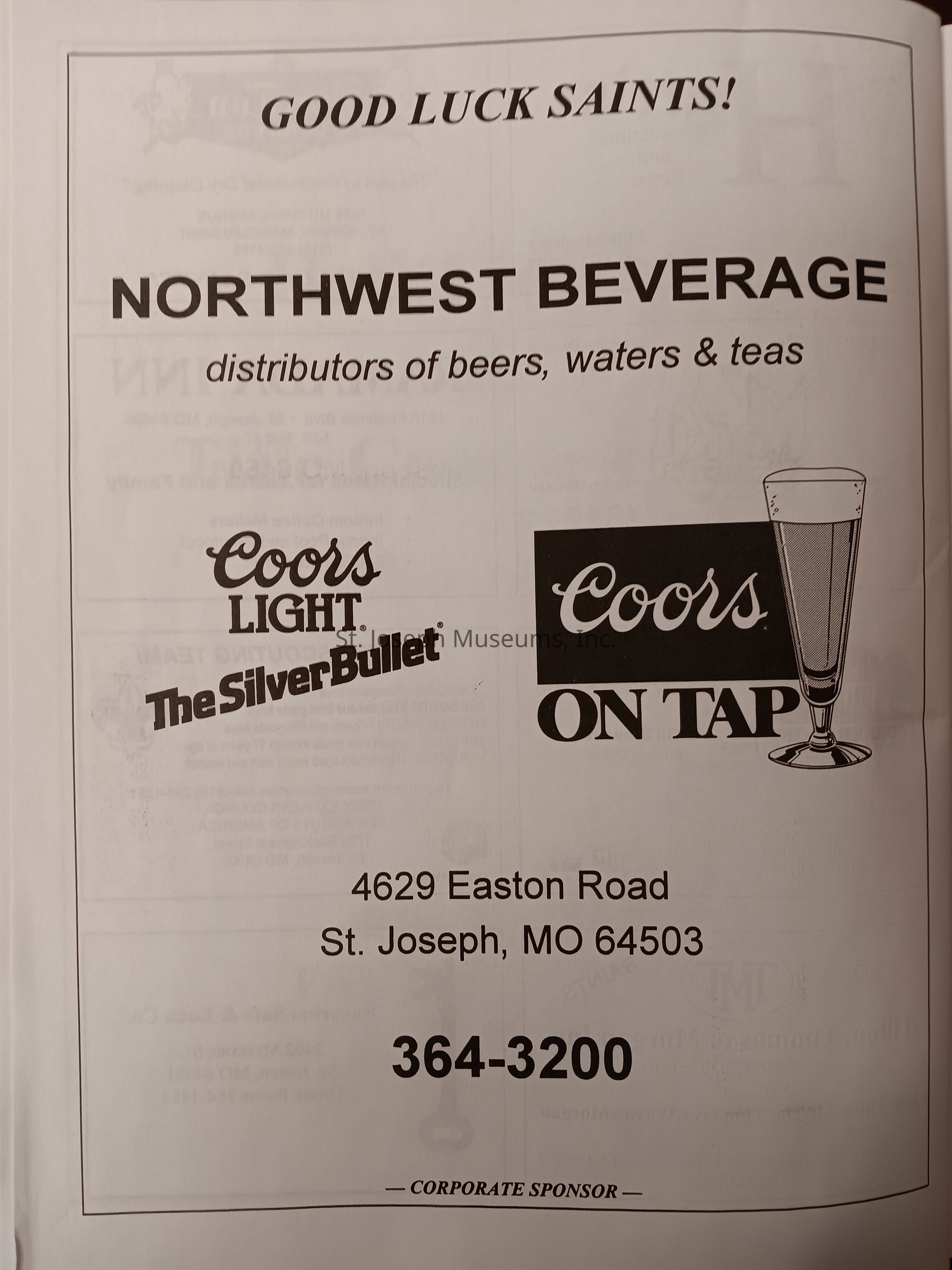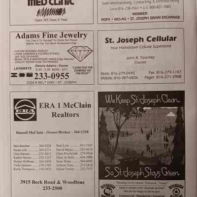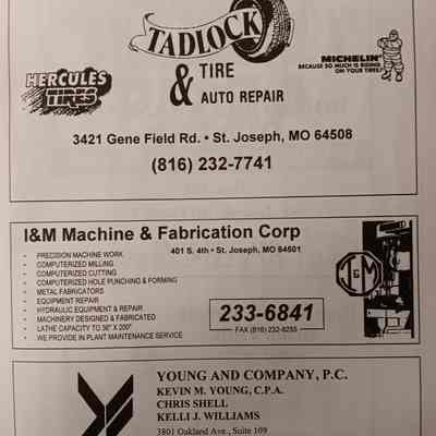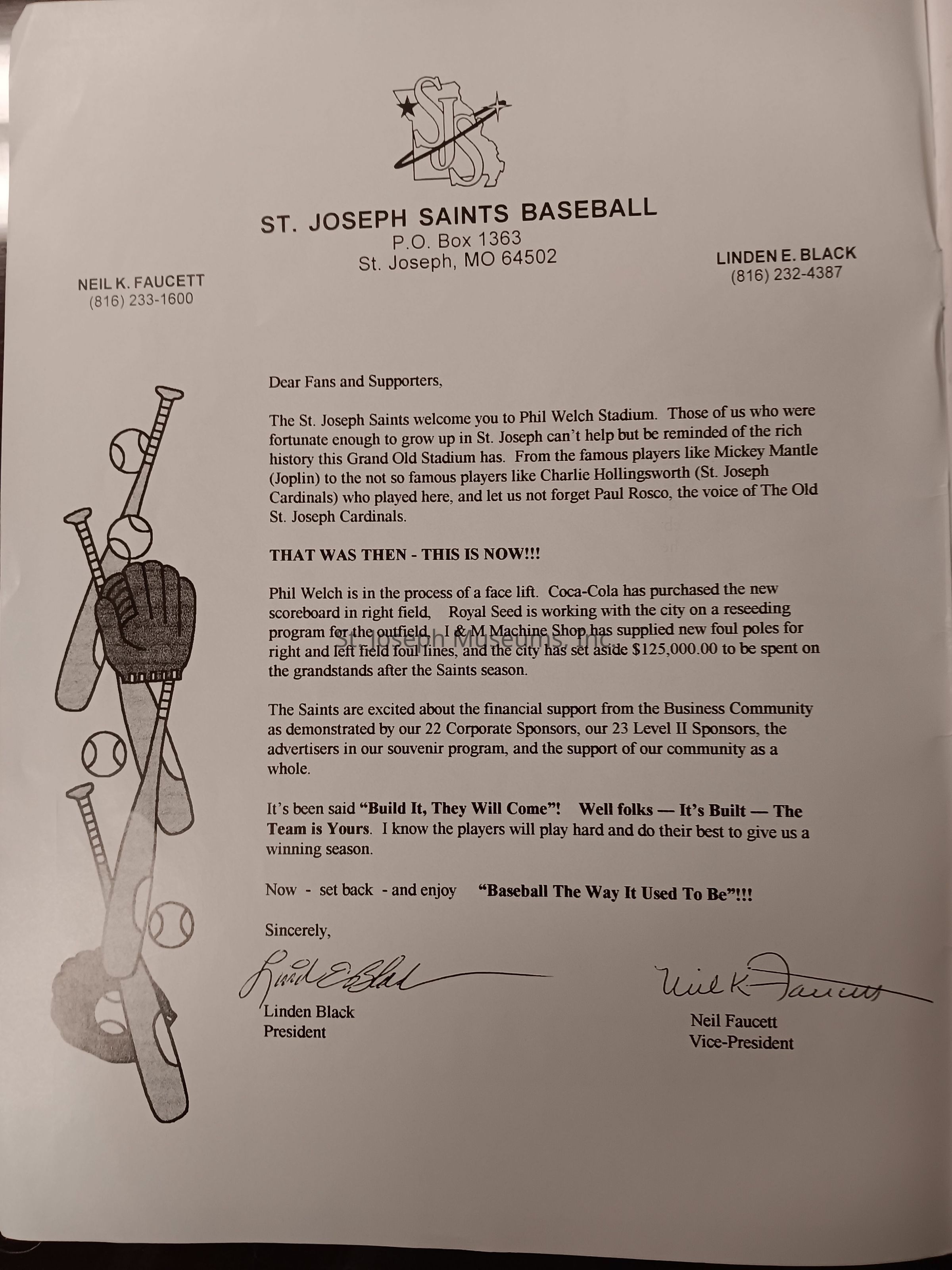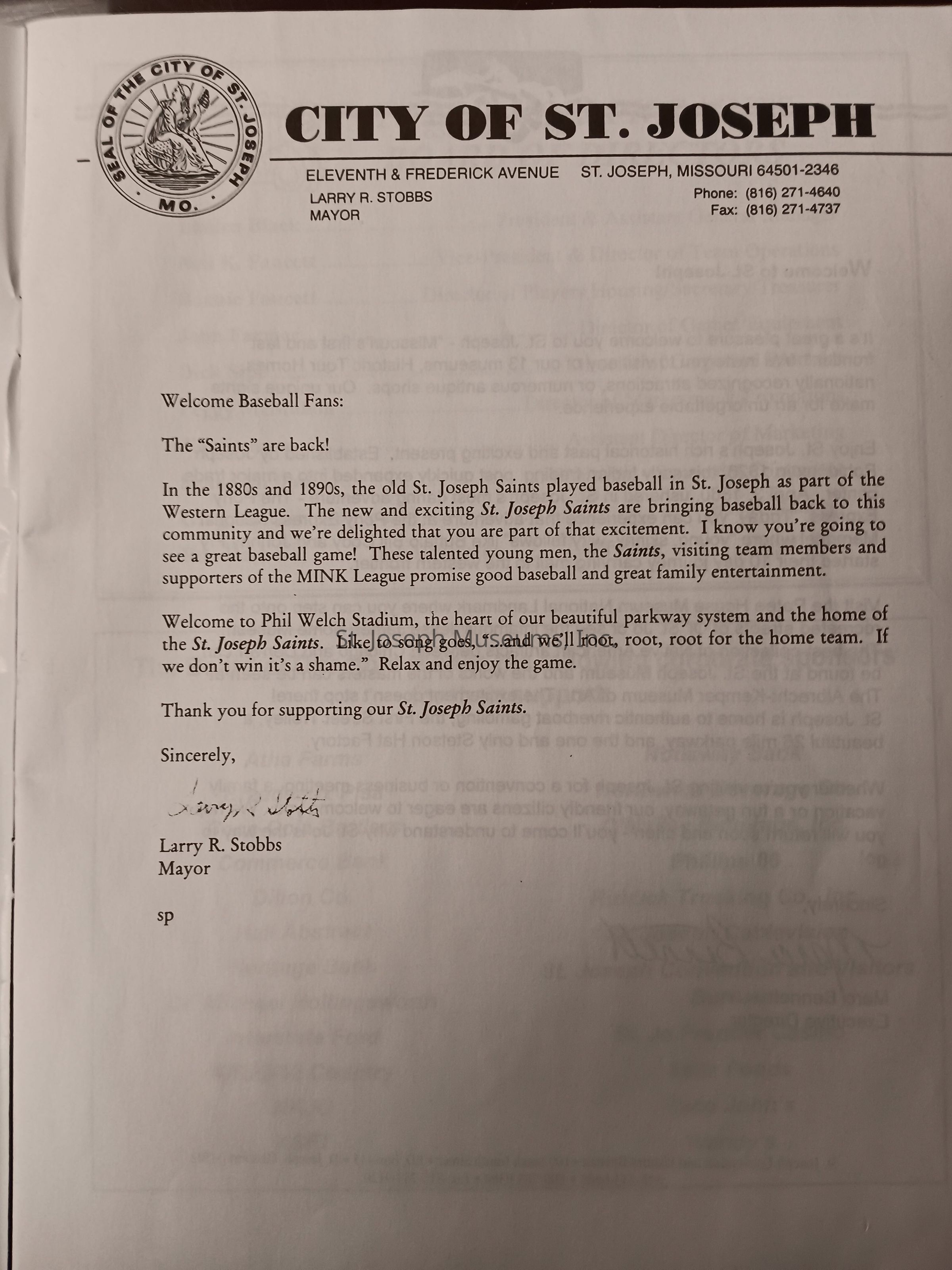 There was no Table of Contents nor page numbers in the first magazine. This being the inaugural edition it contains letters from the newly formed St. Joseph Saints Baseball President, and welcome letters from the City of St. Joseph and the Convention and Visitors Bureau. The first issue lists the Board of Directors and the M.I.N.K. (Missouri, Iowa, Nebraska, and Kansas) Baseball League teams. There are several pages devoted to photos of the players, coaches, and staff as well as space for autographs. The remainder of the issue contains advertisers and Corporate Sponsors.Lexicon
