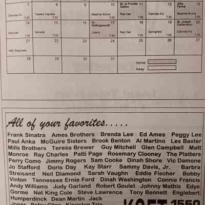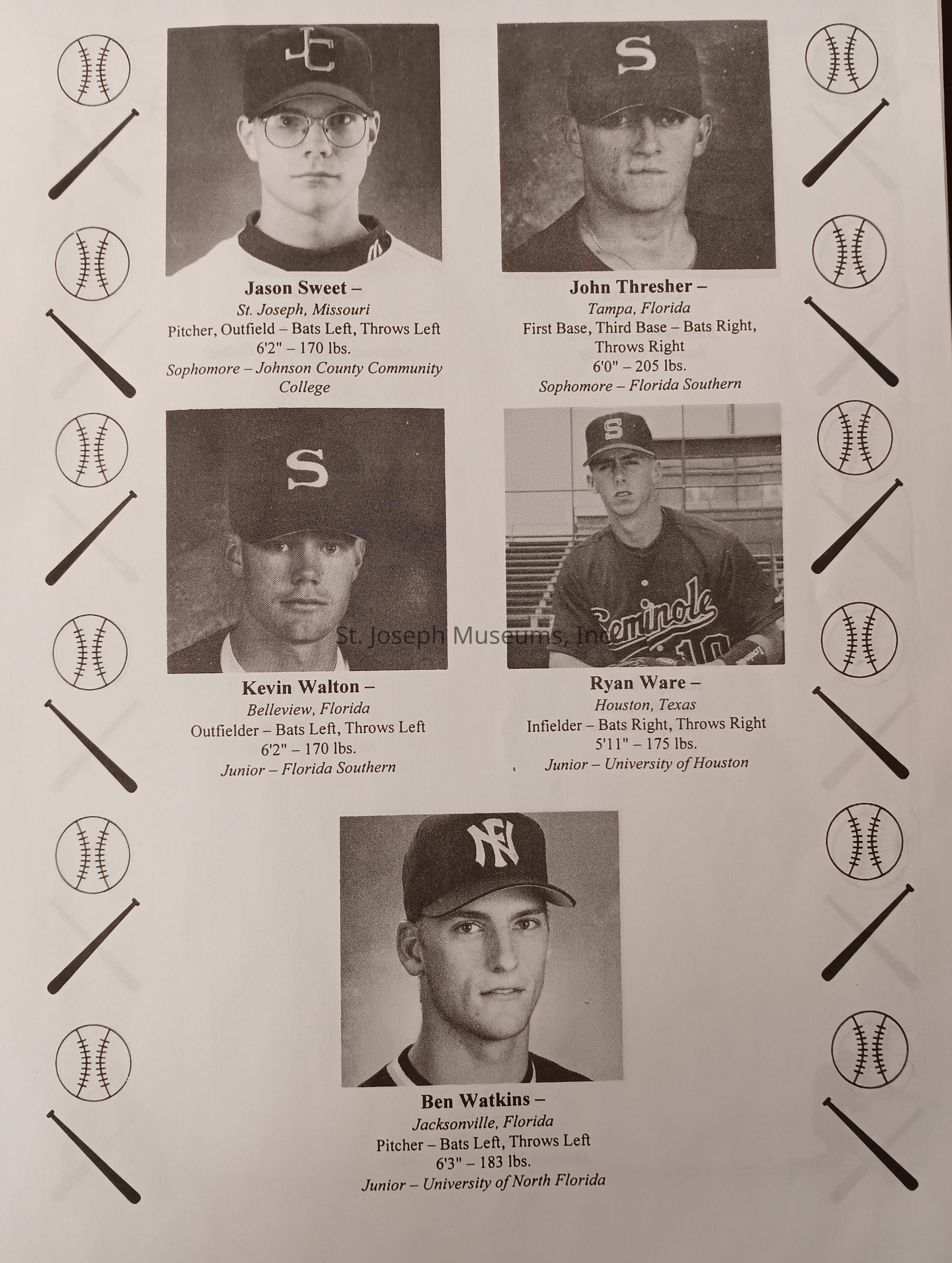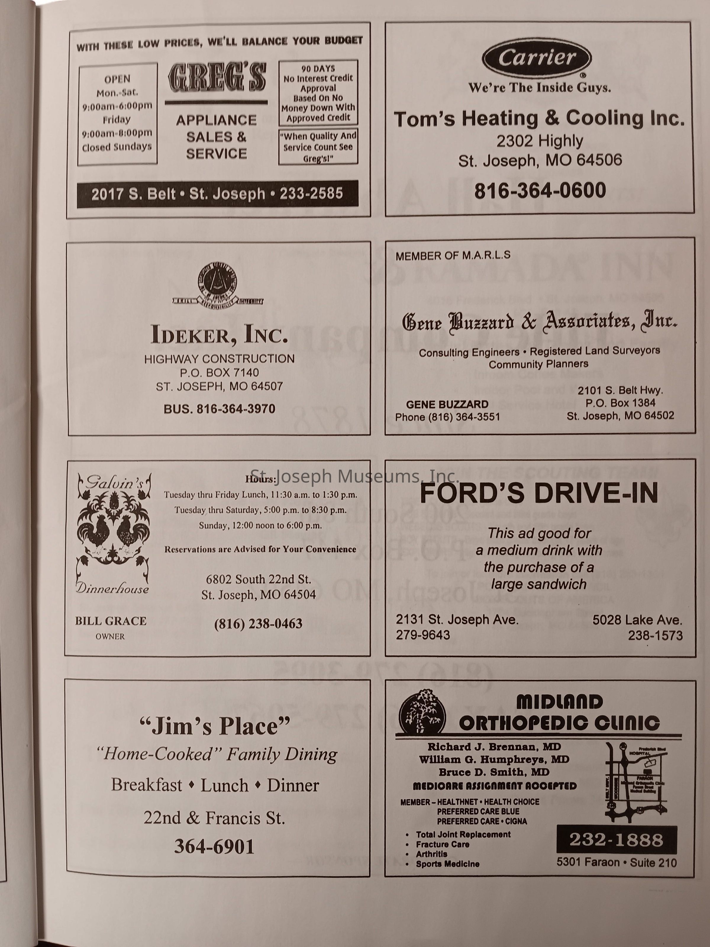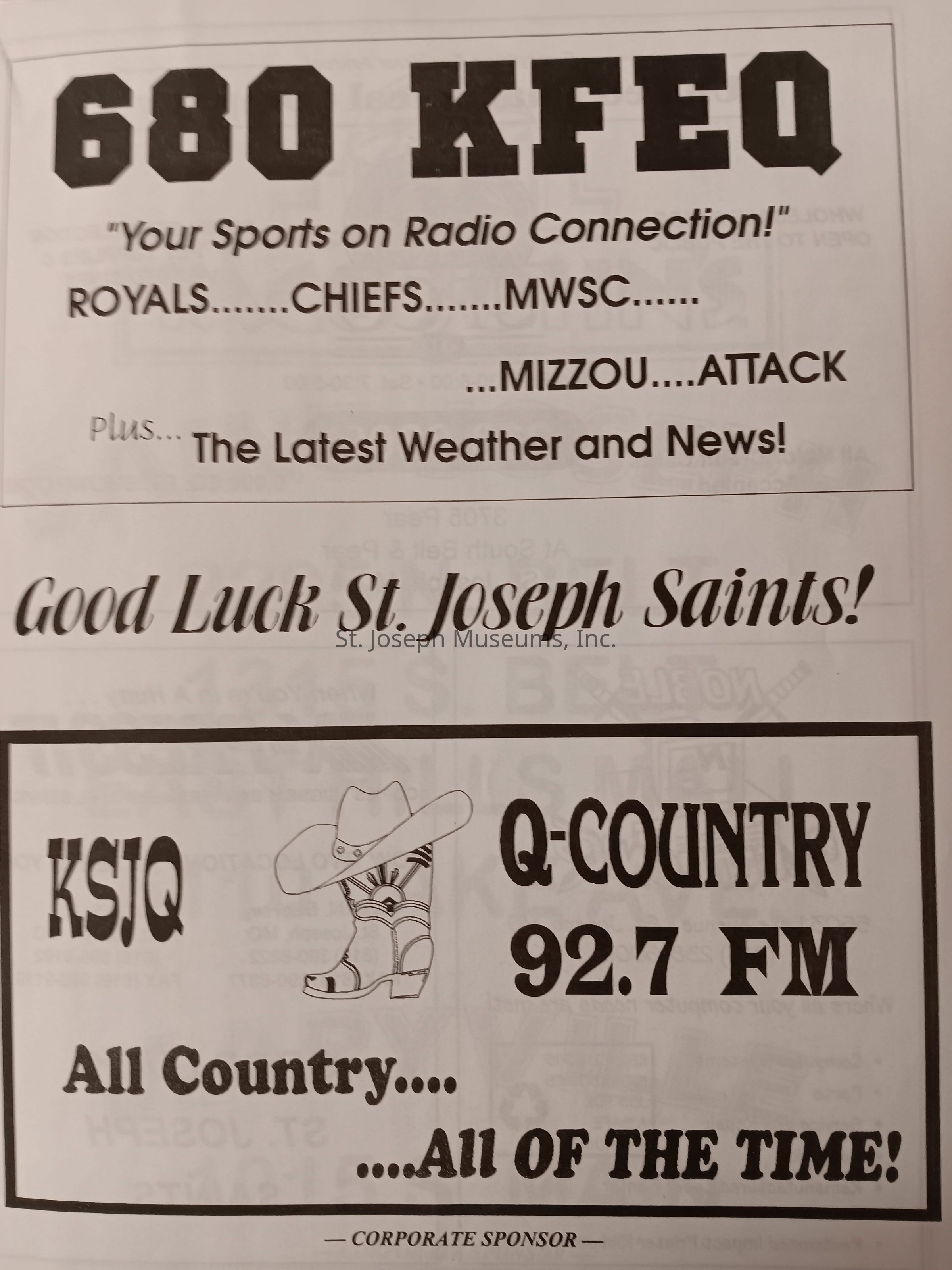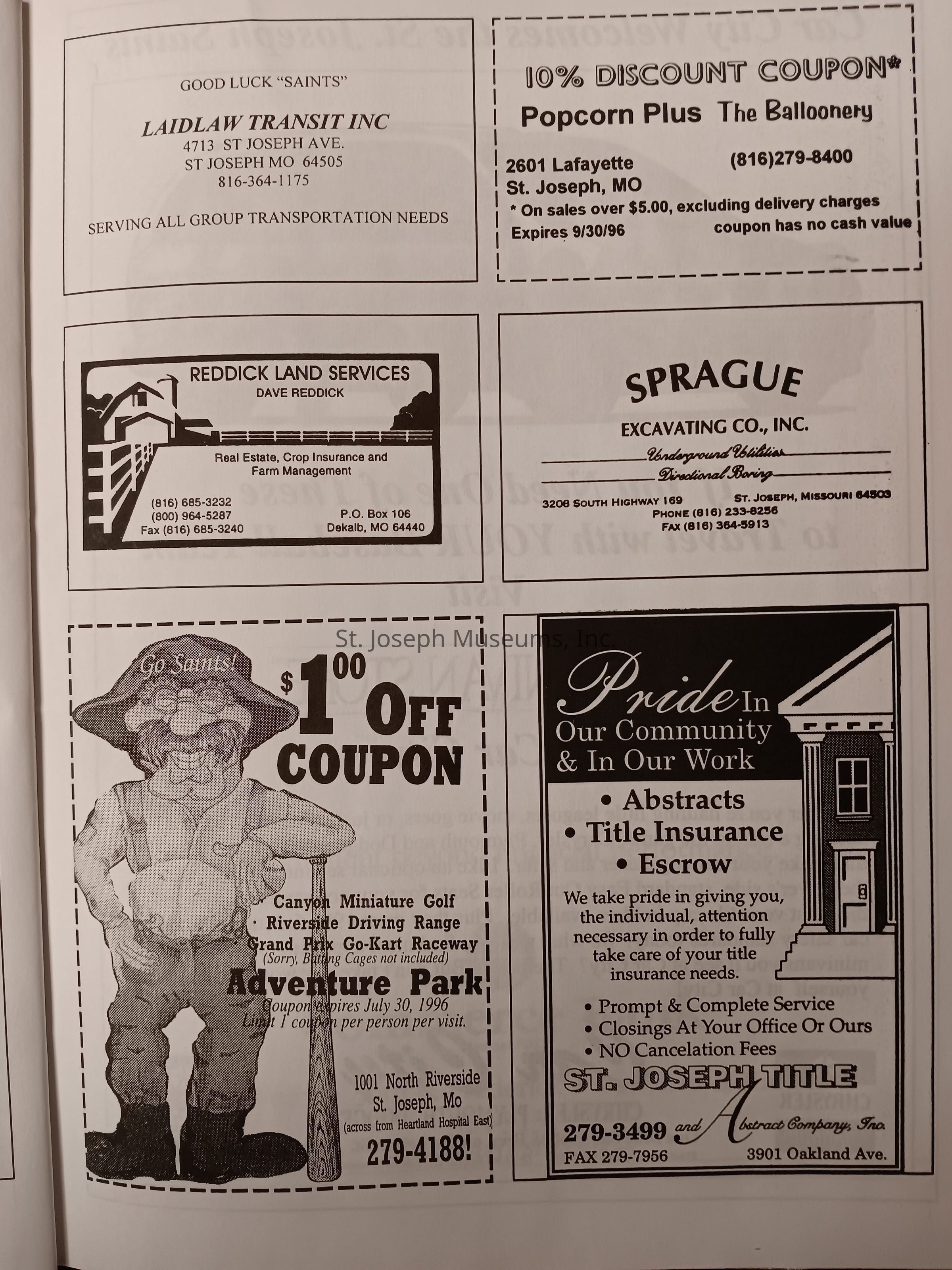 There was no Table of Contents nor page numbers in the first magazine. This being the inaugural edition it contains letters from the newly formed St. Joseph Saints Baseball President, and welcome letters from the City of St. Joseph and the Convention and Visitors Bureau. The first issue lists the Board of Directors and the M.I.N.K. (Missouri, Iowa, Nebraska, and Kansas) Baseball League teams. There are several pages devoted to photos of the players, coaches, and staff as well as space for autographs. The remainder of the issue contains advertisers and Corporate Sponsors.Lexicon