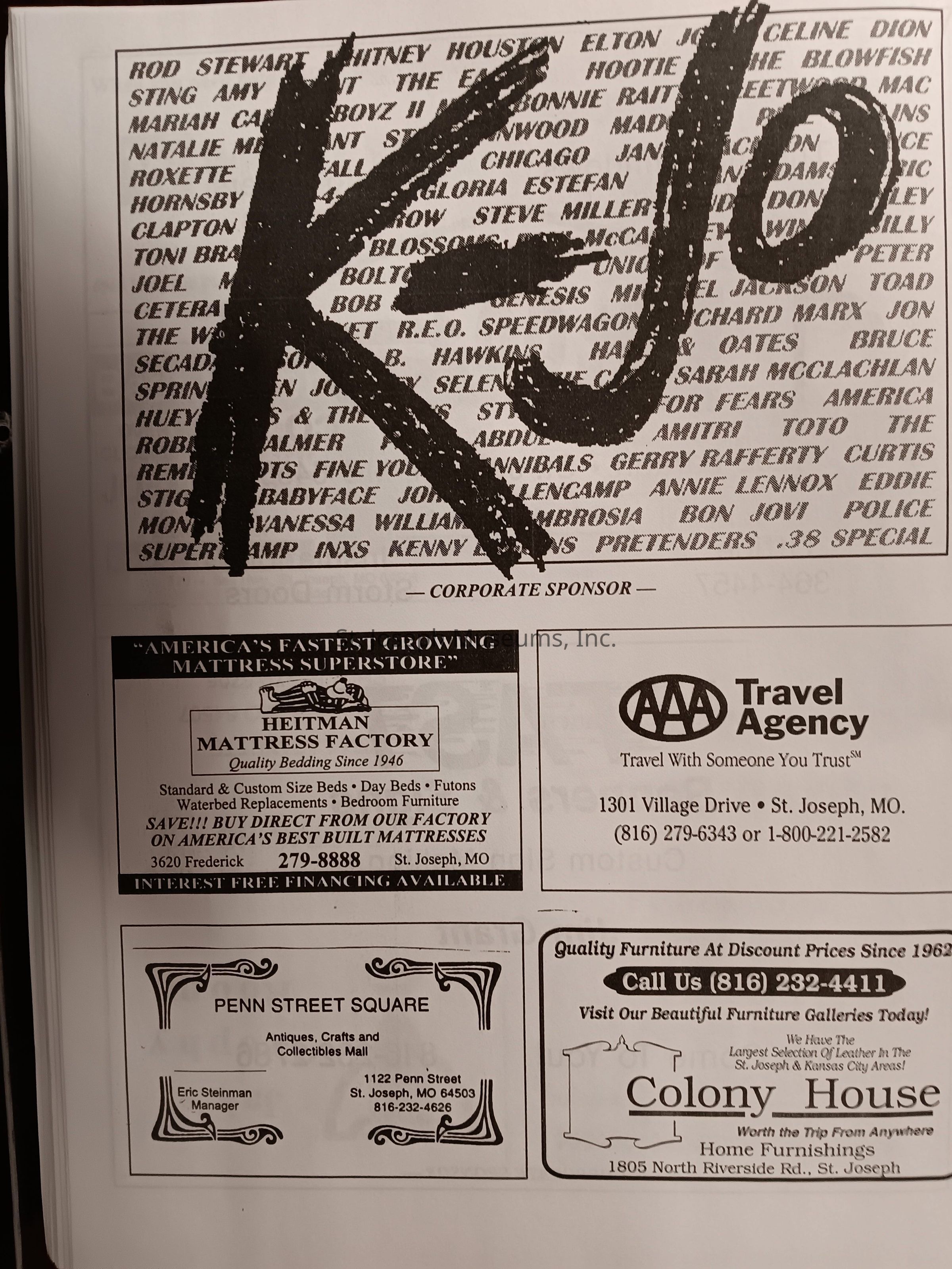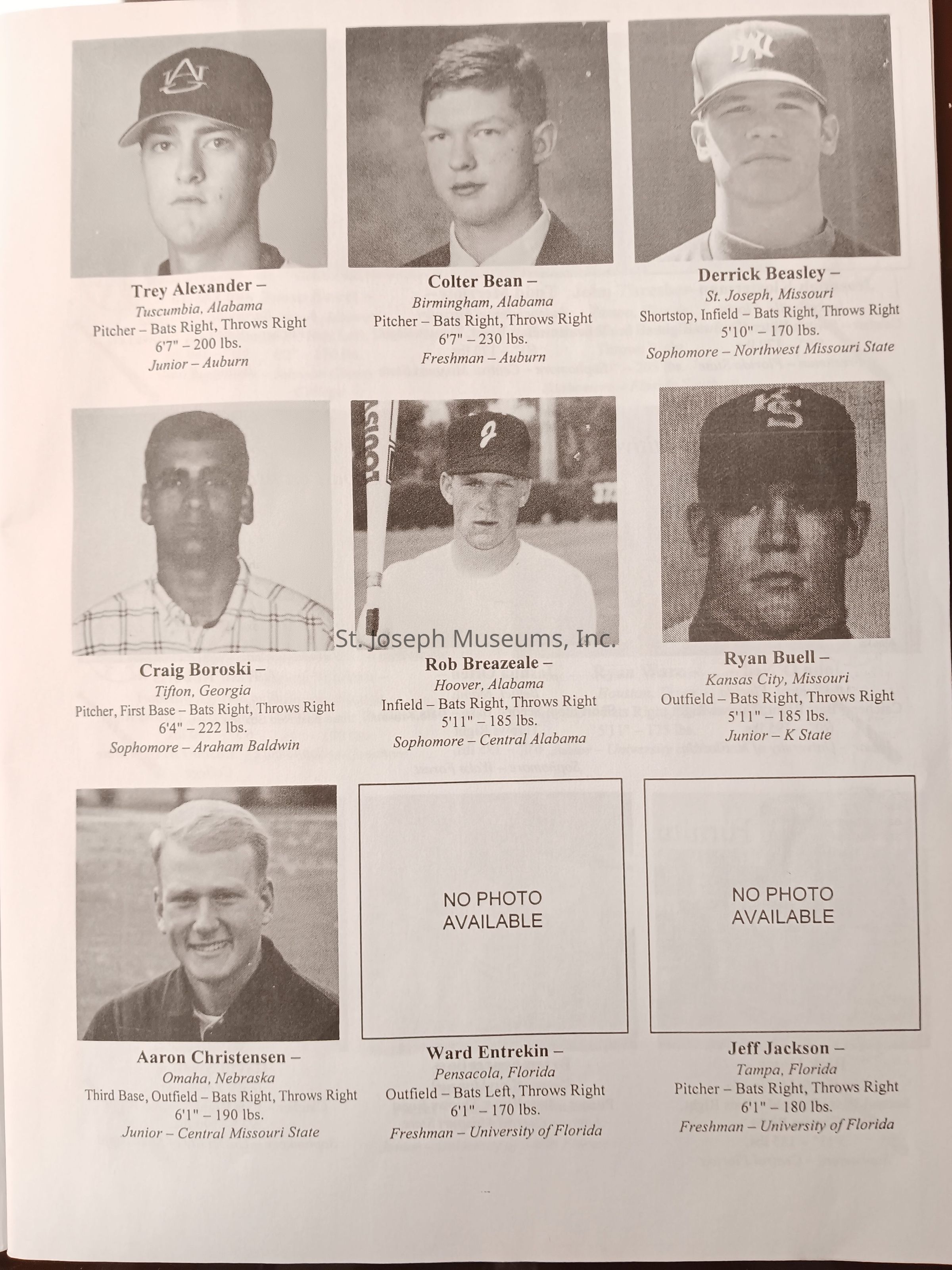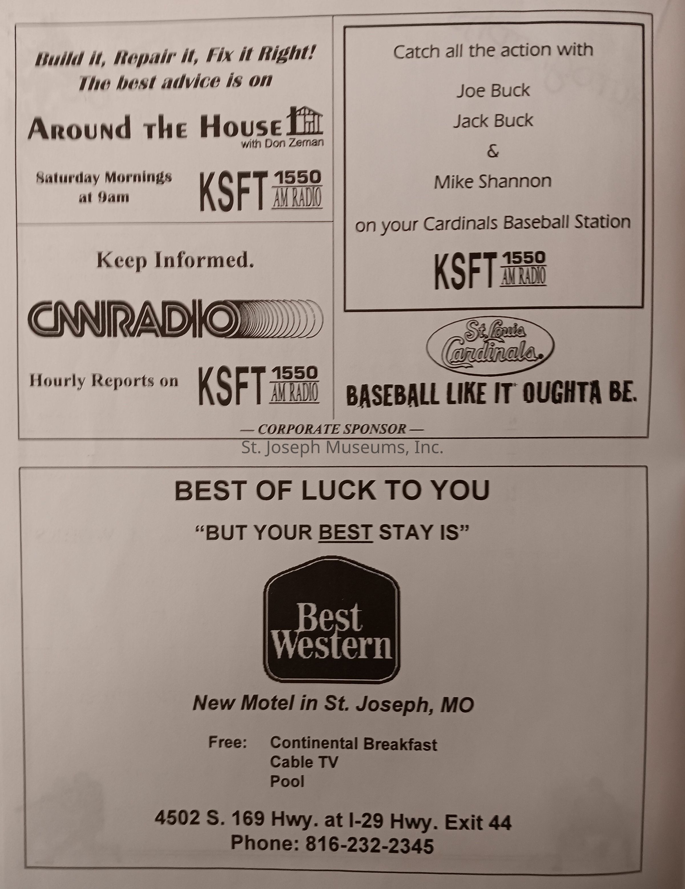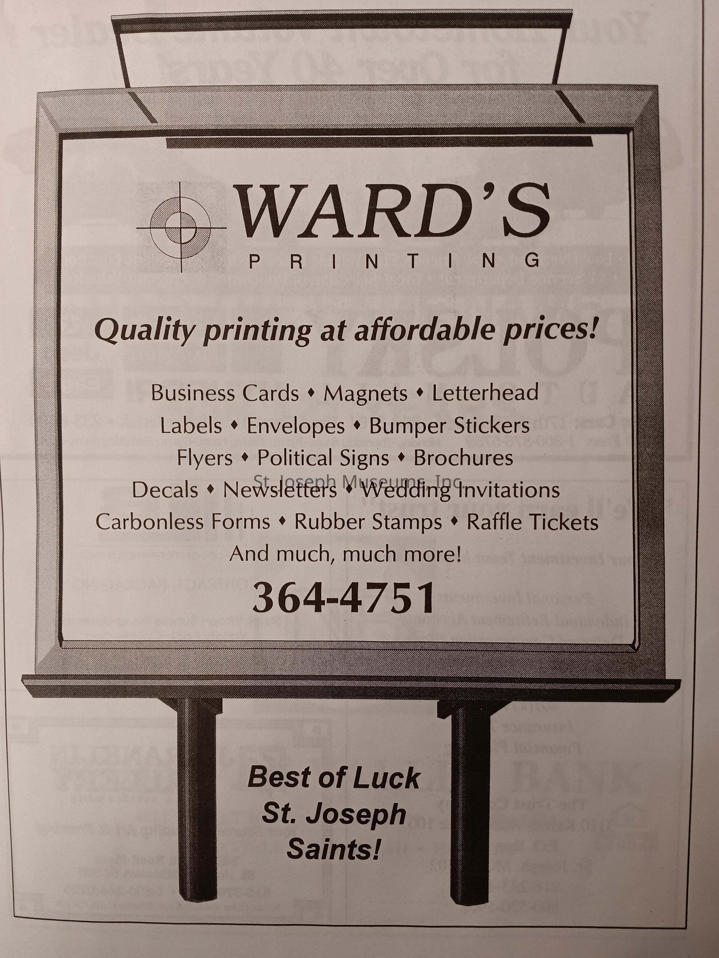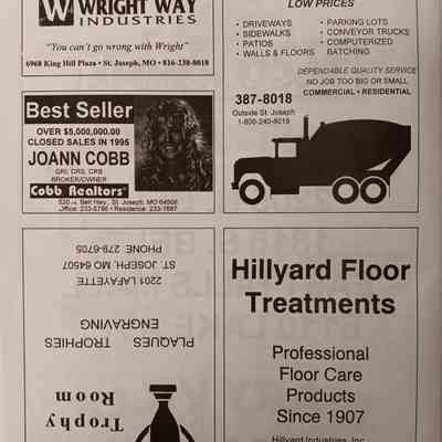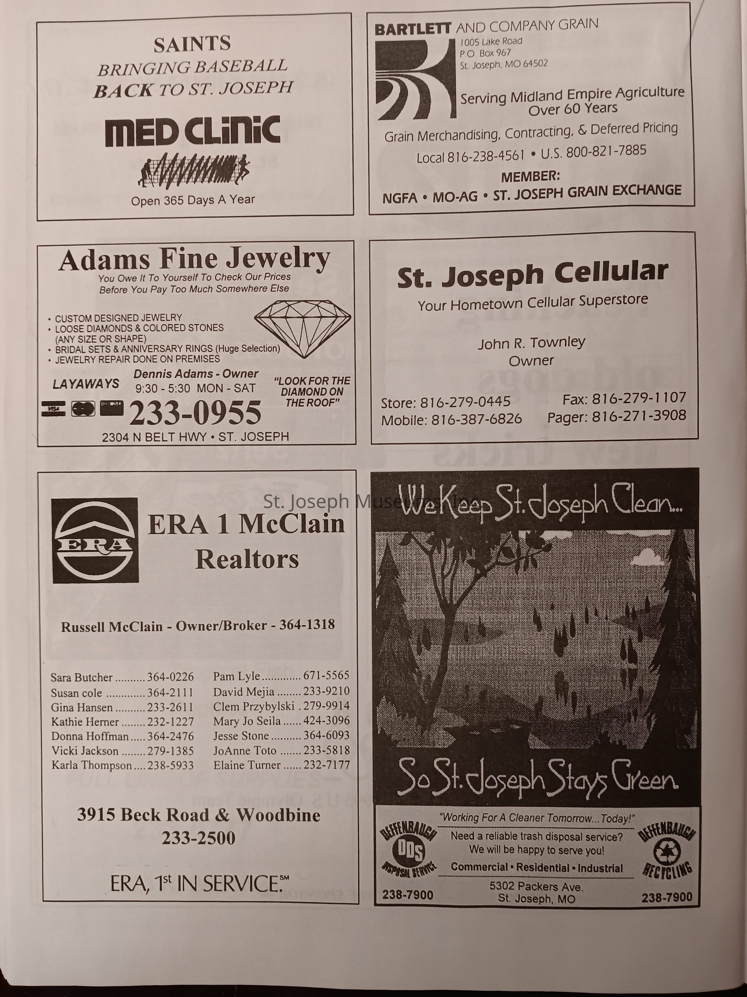 There was no Table of Contents nor page numbers in the first magazine. This being the inaugural edition it contains letters from the newly formed St. Joseph Saints Baseball President, and welcome letters from the City of St. Joseph and the Convention and Visitors Bureau. The first issue lists the Board of Directors and the M.I.N.K. (Missouri, Iowa, Nebraska, and Kansas) Baseball League teams. There are several pages devoted to photos of the players, coaches, and staff as well as space for autographs. The remainder of the issue contains advertisers and Corporate Sponsors.Lexicon