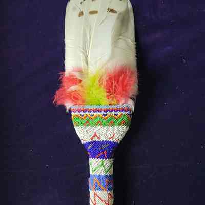 Peyote Fan/ceremonial/Snowy Owl Tail feathers/down feathers/wood/bark/glass & metal beads/native leather/pigment/poss Fox (Mesquakie)