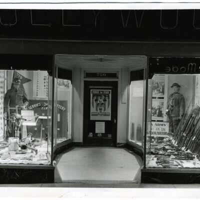Caption on the back reads: "Hollywood," front entrance window displays - World War II. Donated by Edward George Borgens, Jr. and Family. Ed is the great-grandson of Gottfried Friedrich Zunkel and Amelia Schwaderer Zunkel.Made/Created