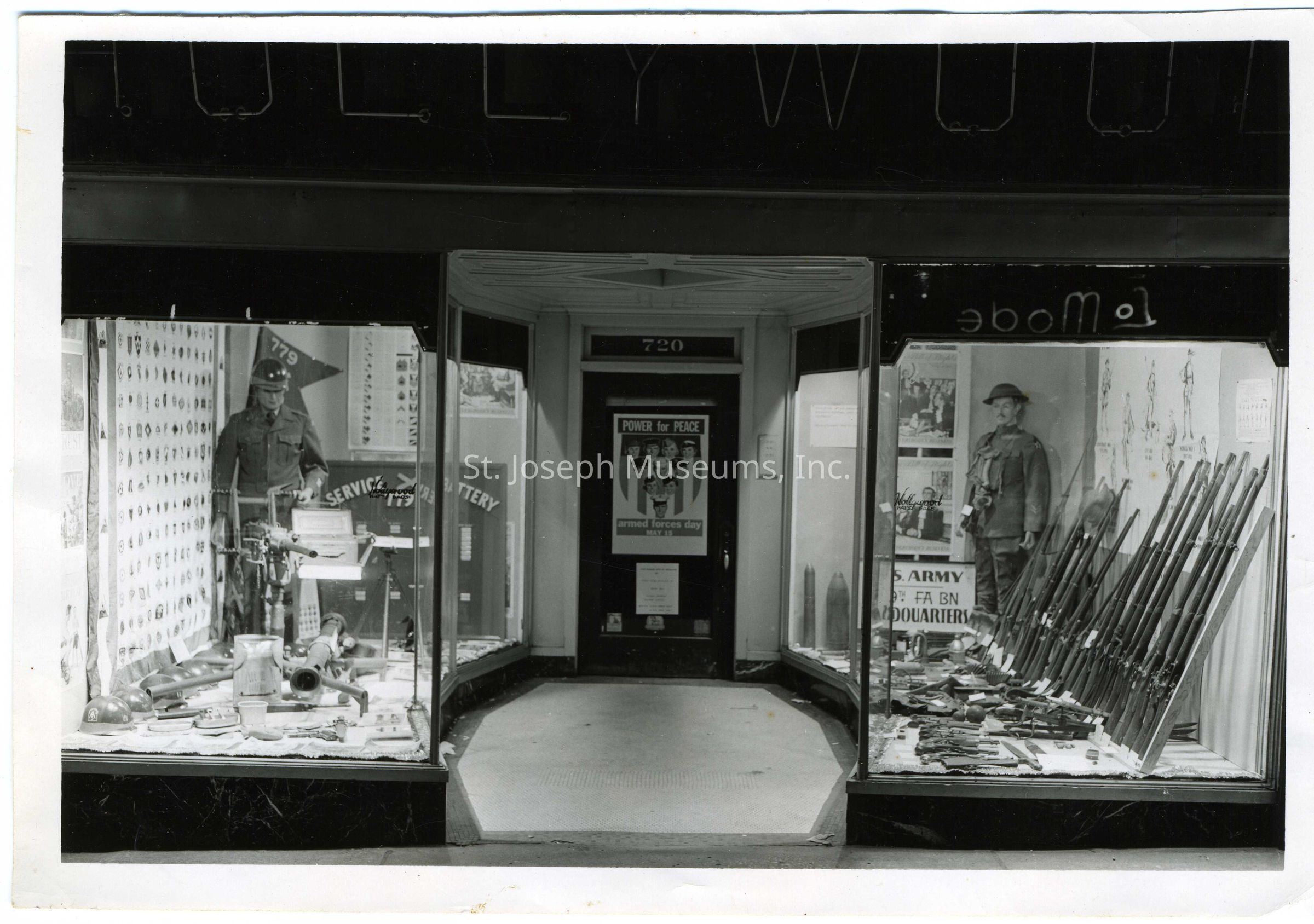Hollywood Hat Store, 720 Felix, St. Joseph, Mo. c. 1942. Photo of same store as 00.31.10 & 11, but years later. Now Hollywood Hats. Window display on right is of maniquinn in uniform with Eisenhower Jacket. Banner for 119th Service Battery & #779 Signal. Left Display is of rifles, bombshells, maniquin with gas mask, sign for Army 9th FA BN, Headquarters. Sign on door is for Armed Forces Day, May 15.