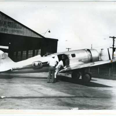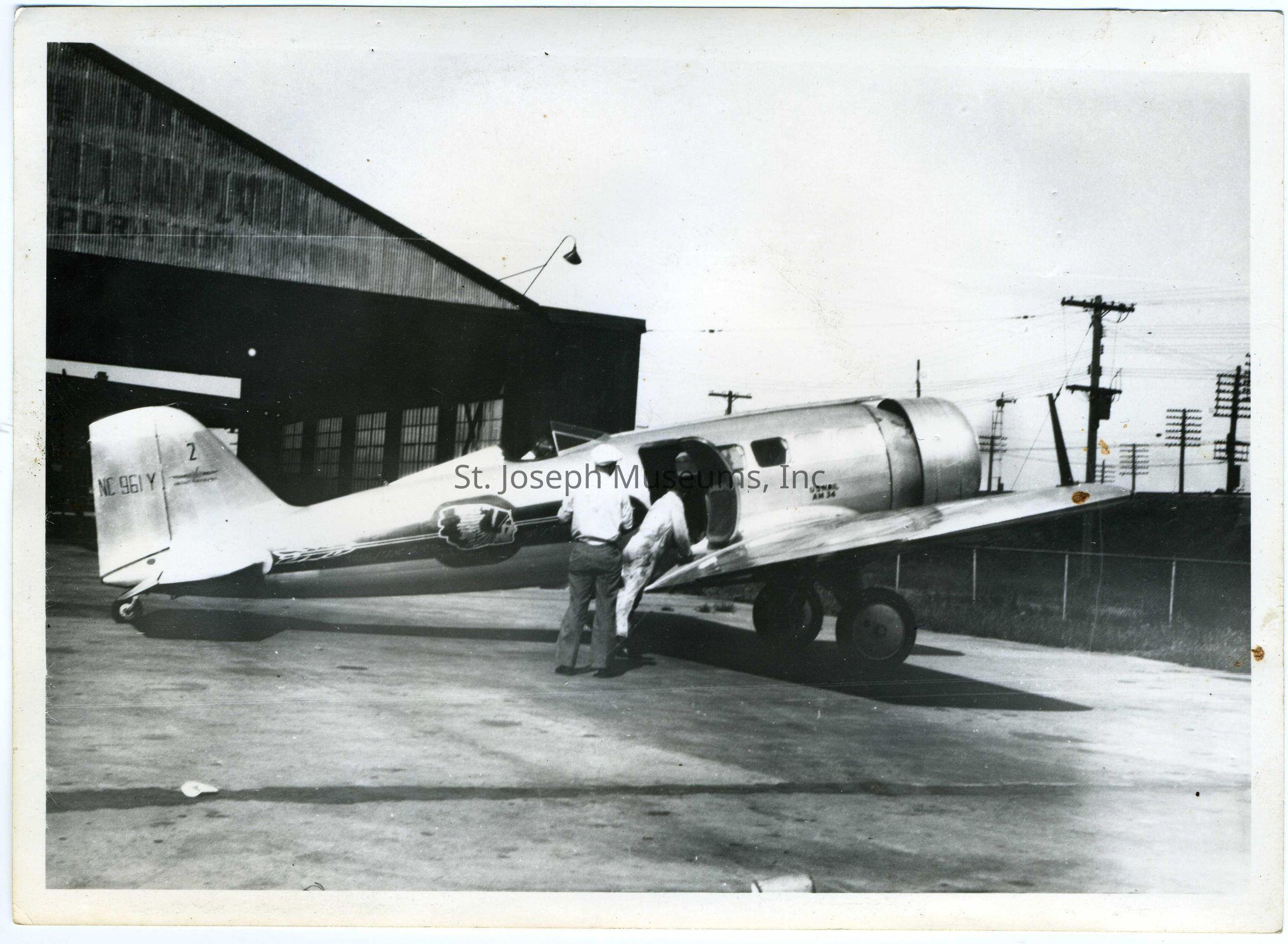 Airmail, Plane at St. Joseph Airport, Waterworks Road, Photo, 1931. U.S. Mail airplane (Northrop Alpha) taken at old St. Joseph airport on Waterworks Road. Two men in the foreground and hangar in the background. Written on the back: Taken at old St. Joseph airport on Waterworks road. This photo taken in 1931 by H. Herrington.