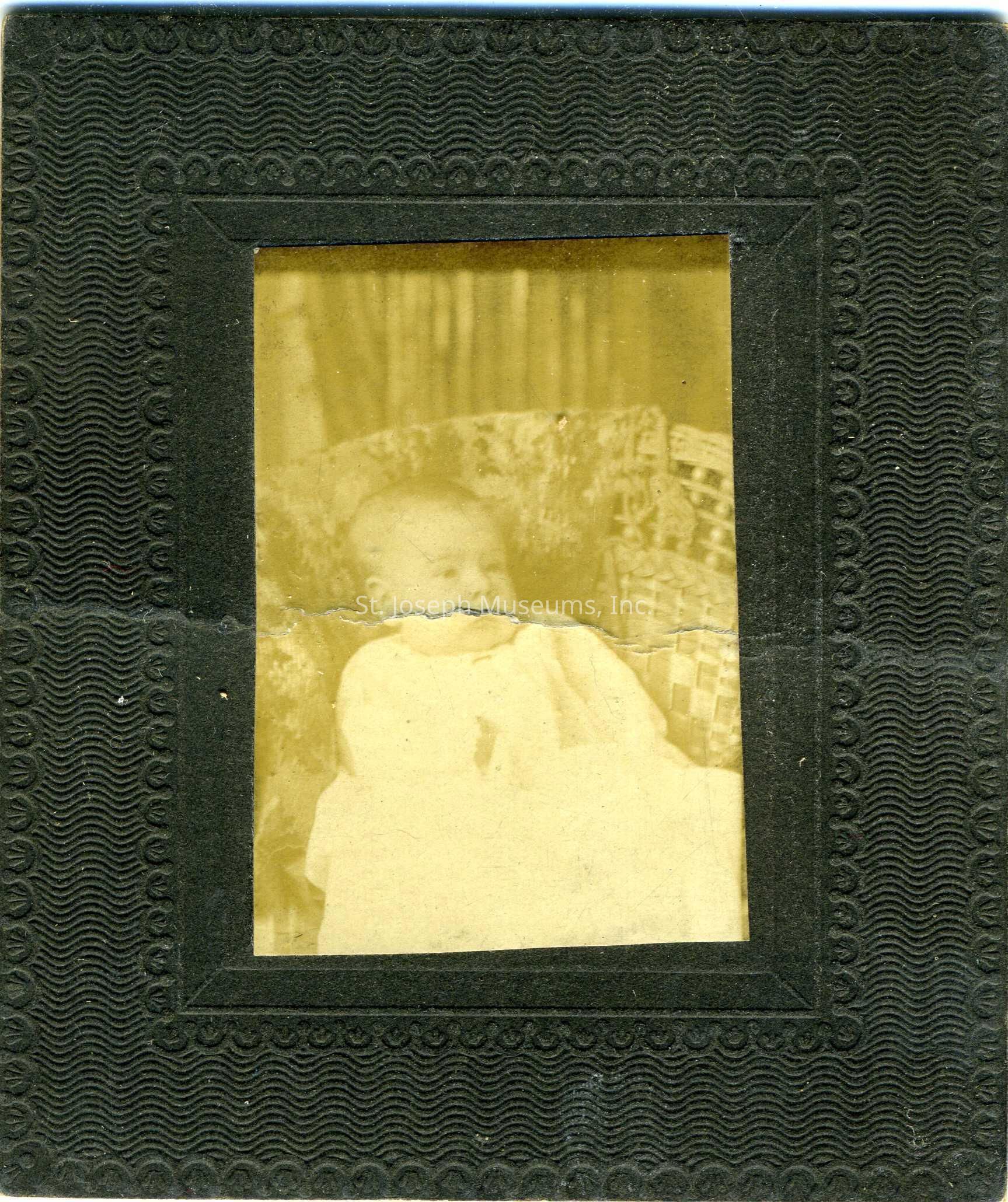 Hubacher: Baby Portrait from Hubacher, undated. Unidentified baby. Baby c. 3 months in white dress. matted against black cardboard mat, cracked.