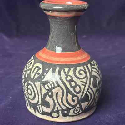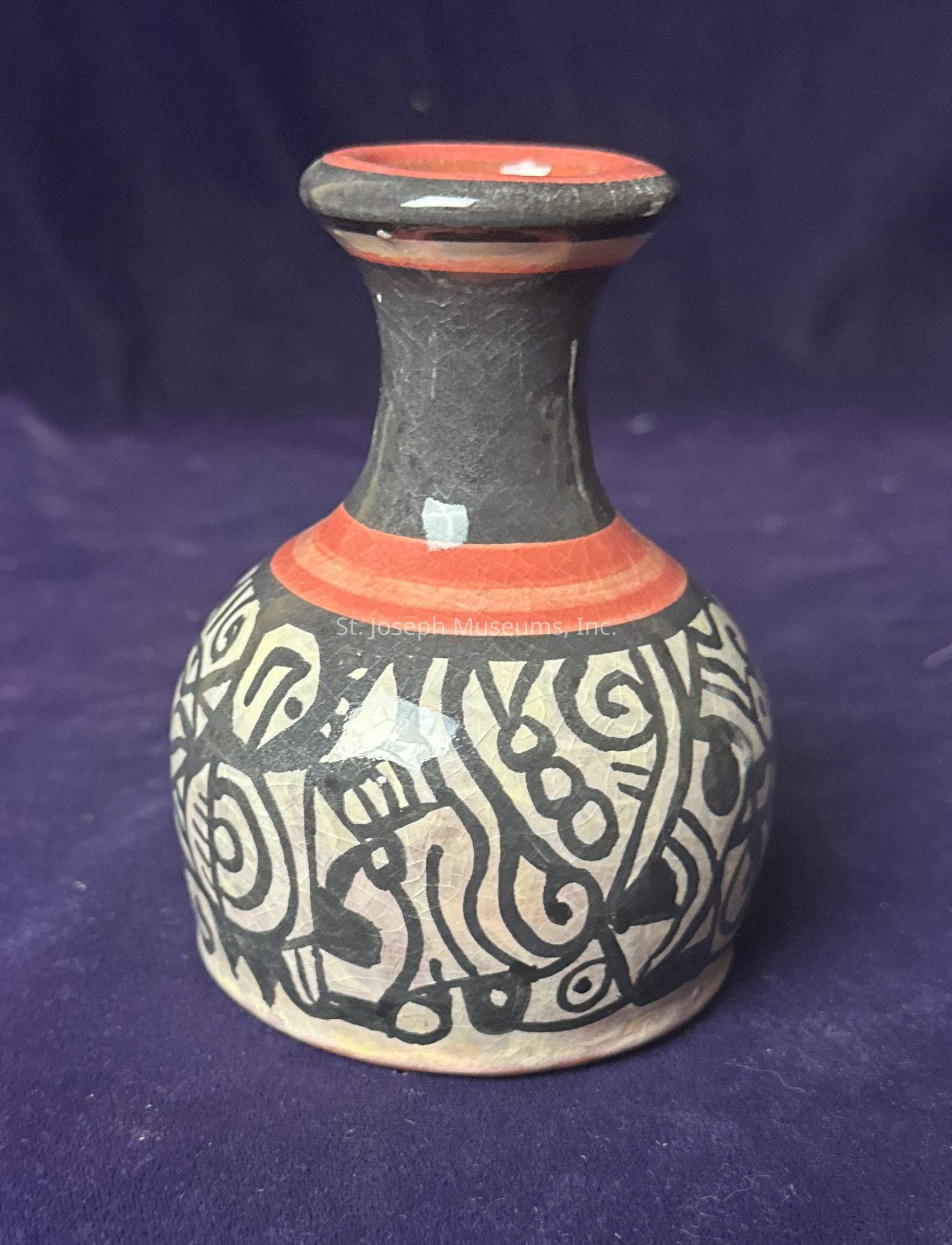 White, black, and red vase with a geometric pattern wrapping around the body created by the artist Don Beaulieu.(bow-lyoo)Context