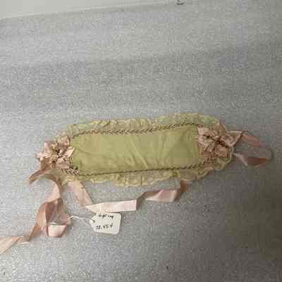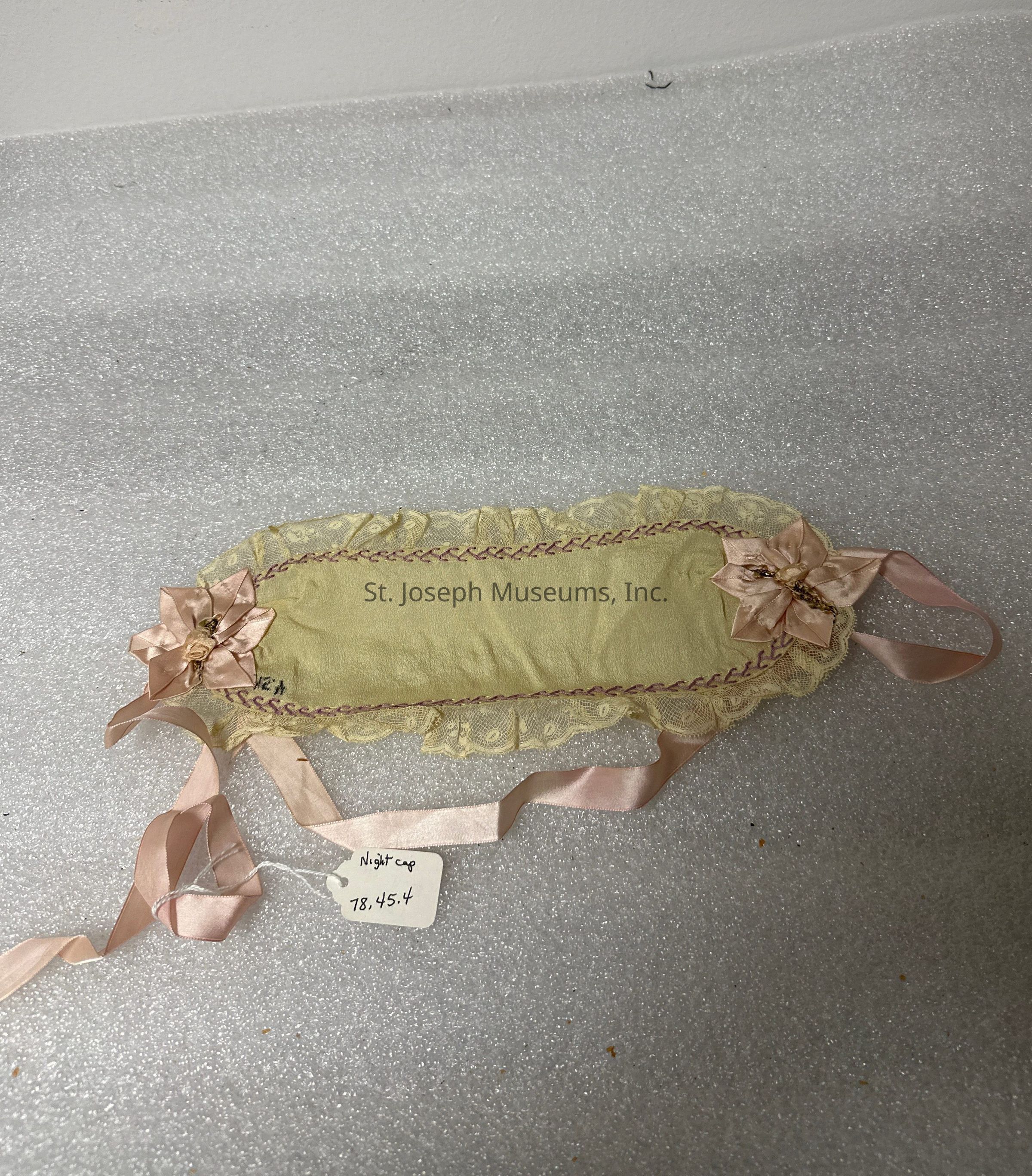 ONE PIECE GOES OVER HEAD AND TIES UNDER CHIN/GREEN/PINK ROSETTES AT EARS/PINK RIBBON TIES/AGE UNKNOWN