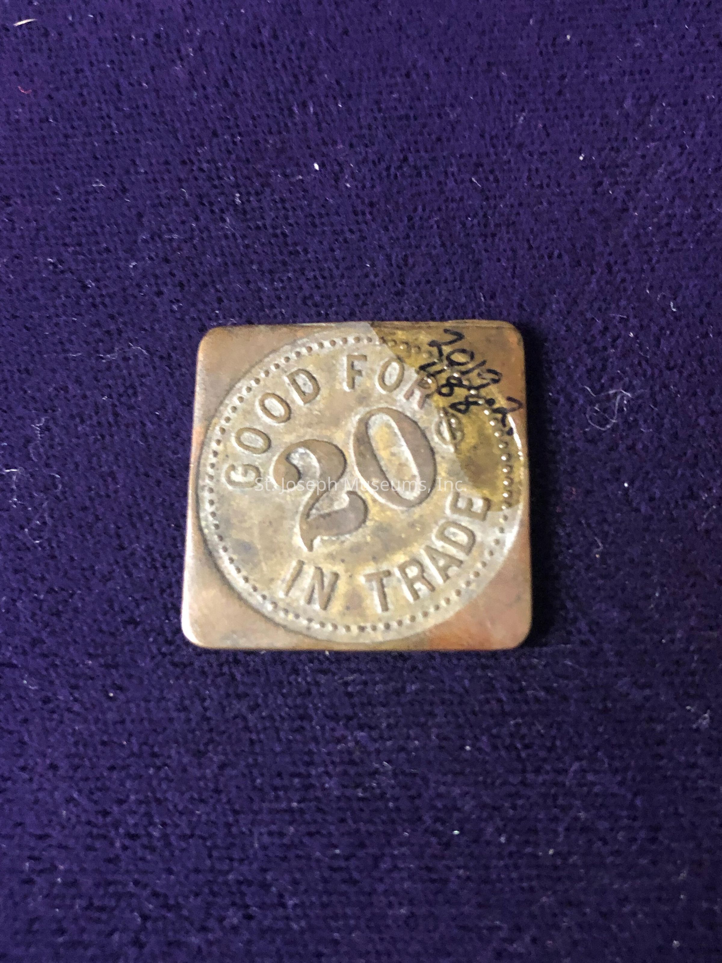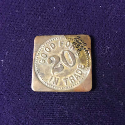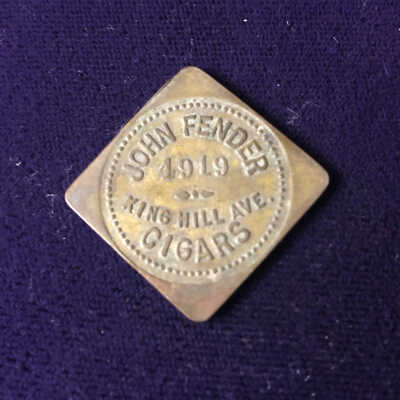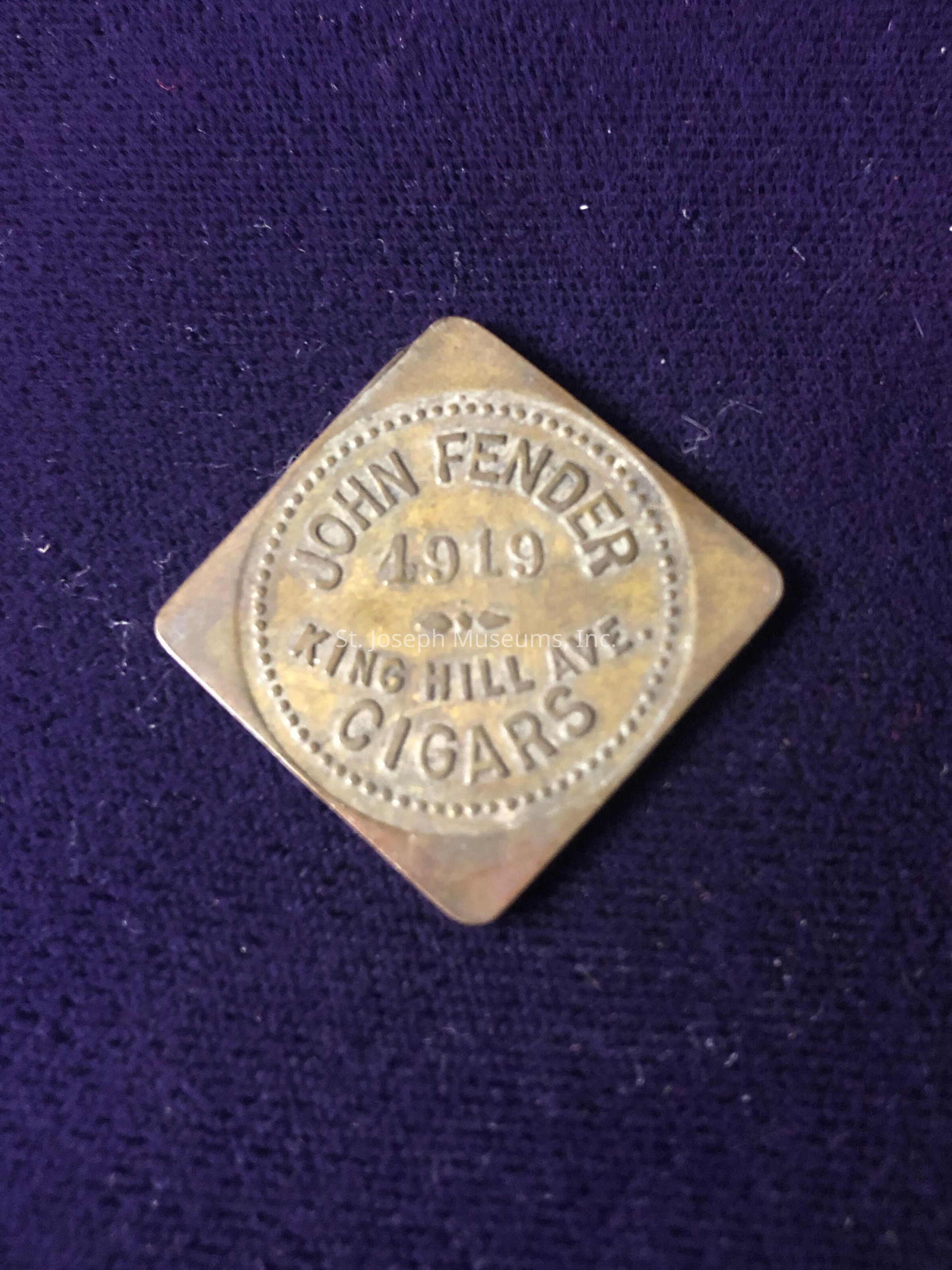 Coin, metal. Bronze, squar. "John Fender 1919 King Hill Ave Cigars" "Good for 20cents in Trade"Collection