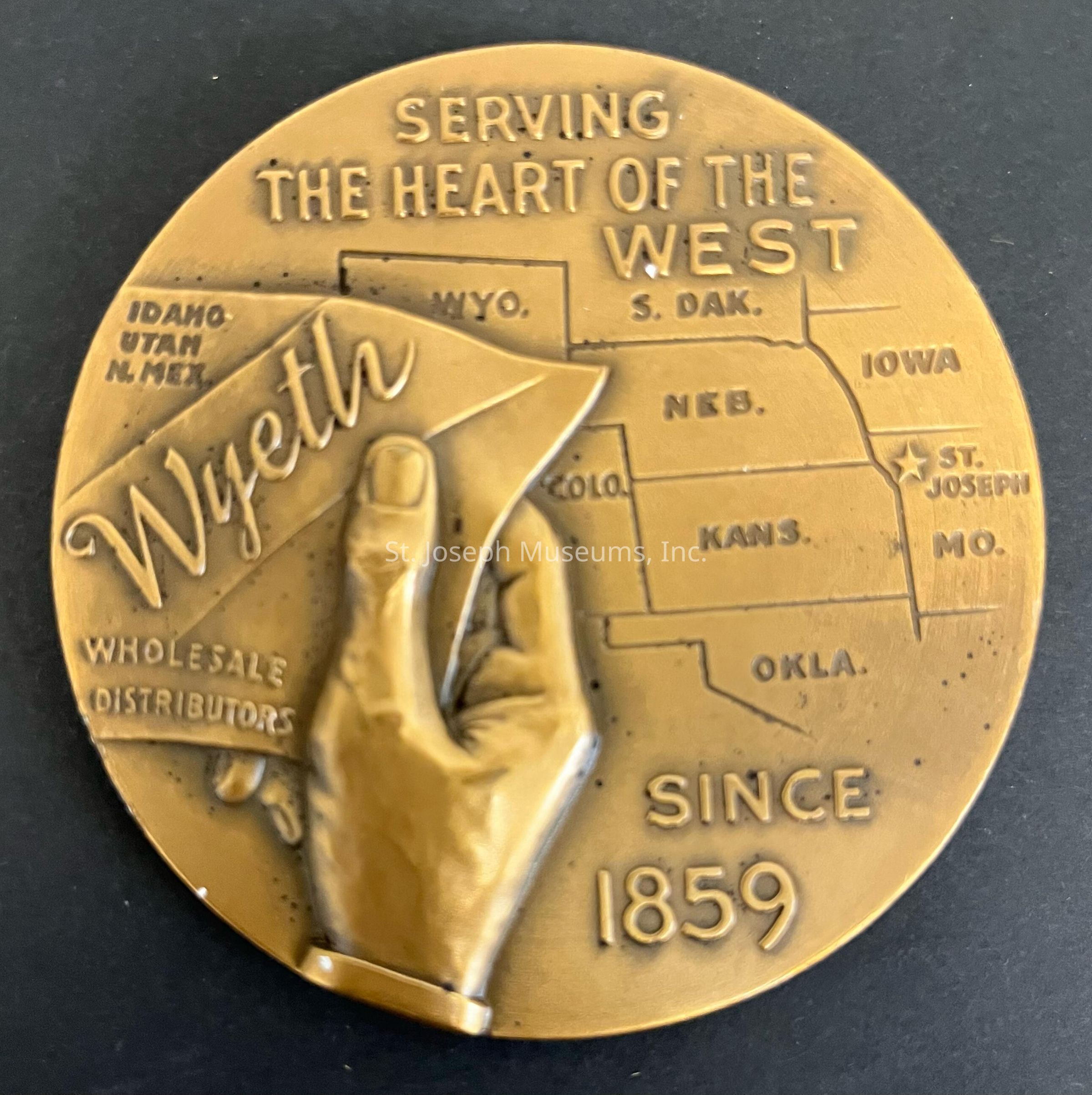 A: Medal, commemorative. 100th Anniversary Medallion of Wyeth Company. Bronze. One side of the coin shows the Wyeth trade mark shield, the other side shows the territory served by the Wyeth Company.