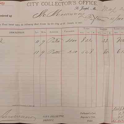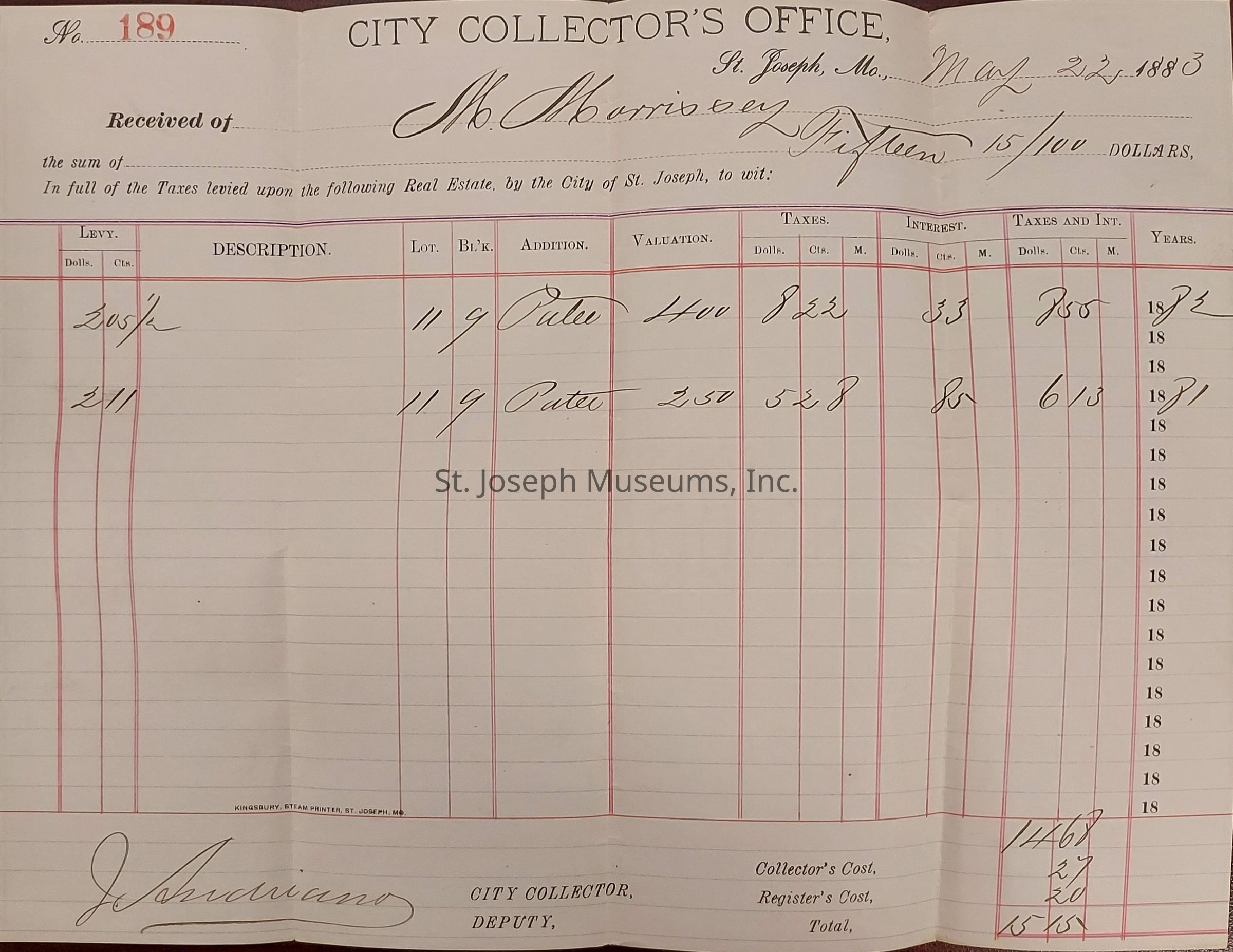 A tri-folded Tax Receipt for M. Morrissey. The document is on City Collector's Office, St Joseph, Mo., receipt and signed by (illegible) City Collector Deputy. It is dated May 22, 1883.Context