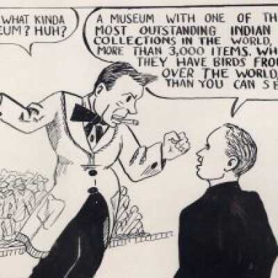 Graham (John) Cartoon, "This Town is Dead", Used in Museum Graphics. Pen/Ink. Three panel cartoon. Man on soap box declare St. Joseph a dead town with no progressive institutions. Man in suit reminds him of St. Joseph Museum, a progressive institution.Lexicon