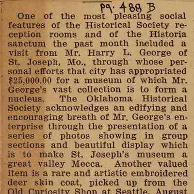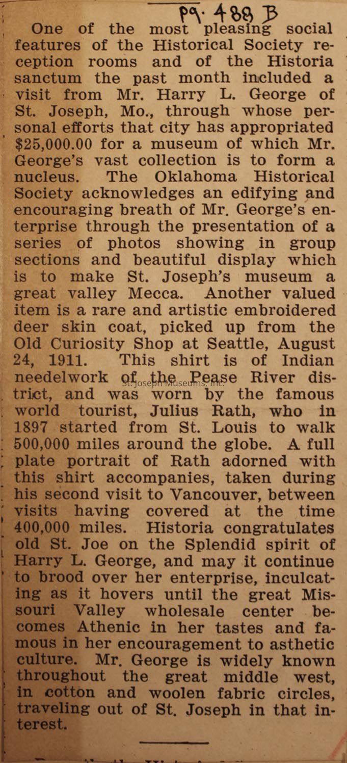This is a newspaper clipping, detailing a notable social event hosted by a Historical Society, highlighting a visit by Mr. Harry L. George from St. Joseph, Missouri. Mr. George's influence led to the appropriation of $25,000 for a museum showcasing his vast collection. The Oklahoma Historical Society expresses gratitude for Mr. George’s contributions, which involve a photo display intended to make St. Joseph’s museum a cultural focal point. The article also mentions a unique embroidered deer skin coat from the Old Curiosity Shop in Seattle, dated August 24, 1911. This coat, originating from Indian needlework of the Pease River district, belonged to Julius Rath, a renowned world traveler from 1897 who embarked from St. Louis, covering about 500,000 miles globally. A portrait of Rath accompanies the coat, taken in Vancouver after completing 400,000 miles. The write-up congratulates St. Joe for the splendid spirit exemplified by Mr. George and his extensive collection.