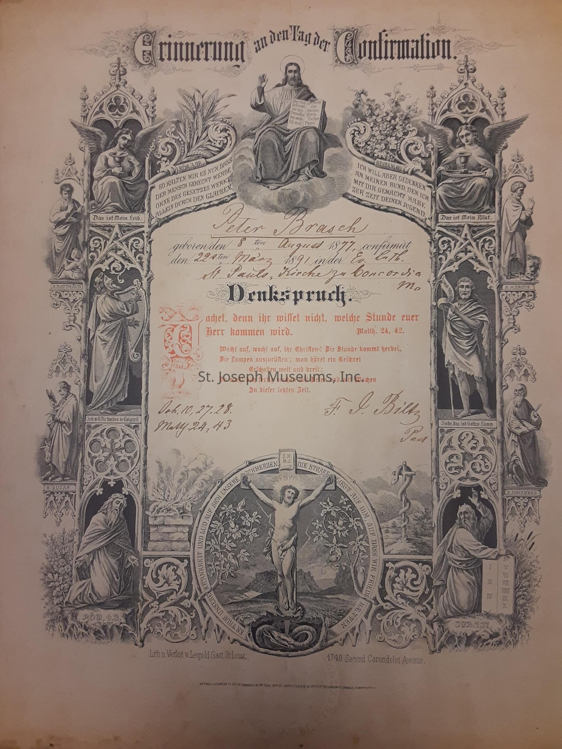 1877 Confirmation Certificate for Peter Brasch for the Church in Concordia, Missouri.