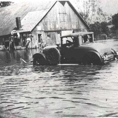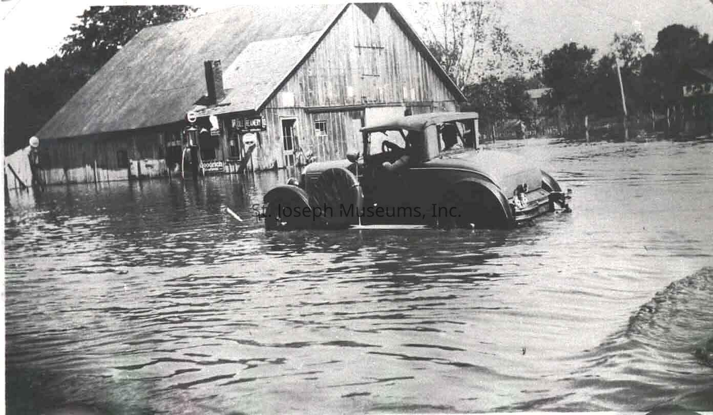 Agency Missouri, Flood Waters at Gas Station, Photo, c. 1930. b/w. Scene of flood waters in front of large barn/filling station. Model A car driving through flood with water up to running board."
