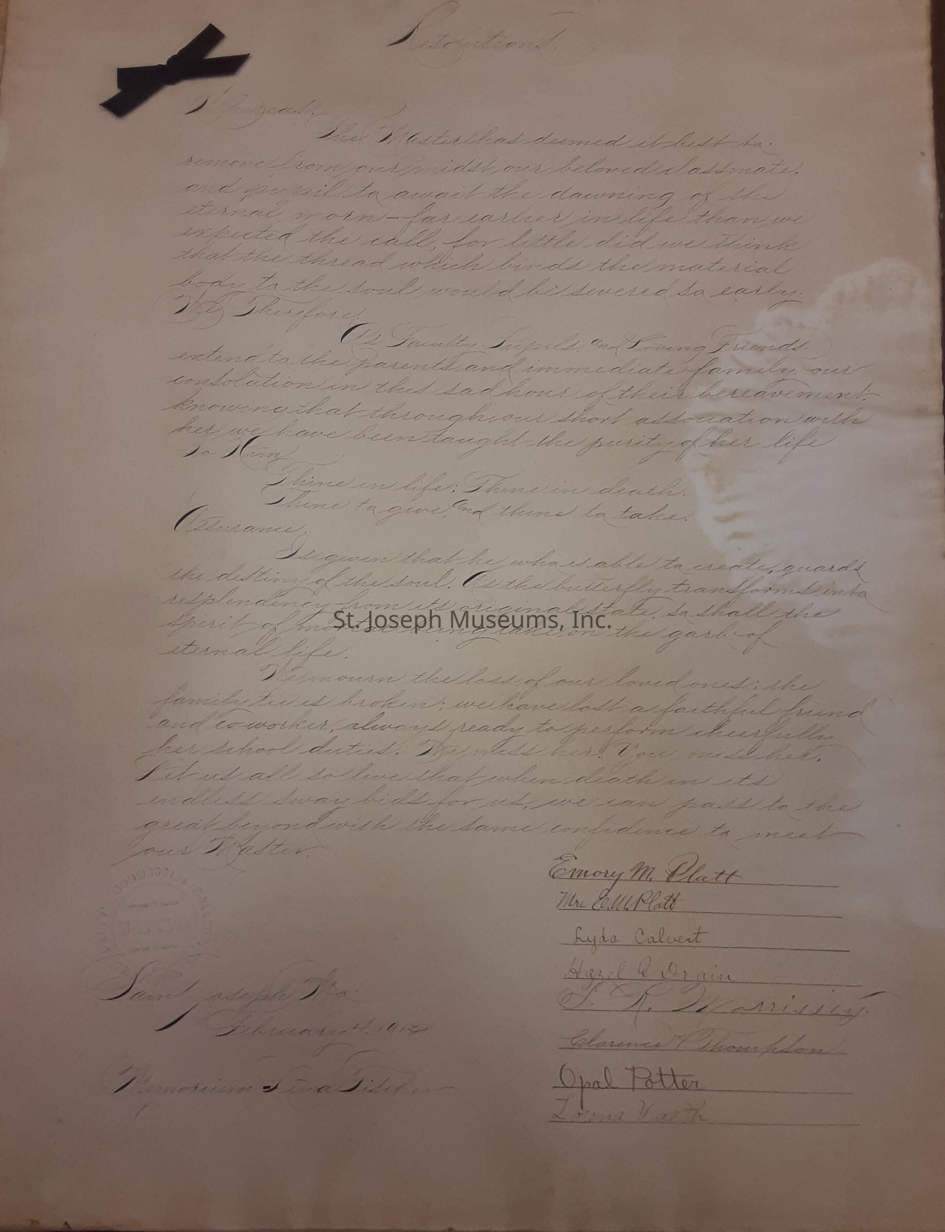 1912 Resolution St. Joseph, MO and Platts Commercial College. Memorium for Lena Fischer dated February 4th, 1912. Signed by Mr. and Mrs. Emory M. Platt, Lyda Calvert, Hazel A. Drain, P. R. Morrissey, Clarence P. Thompson, Opal Potter, and Lorena Vaeth.