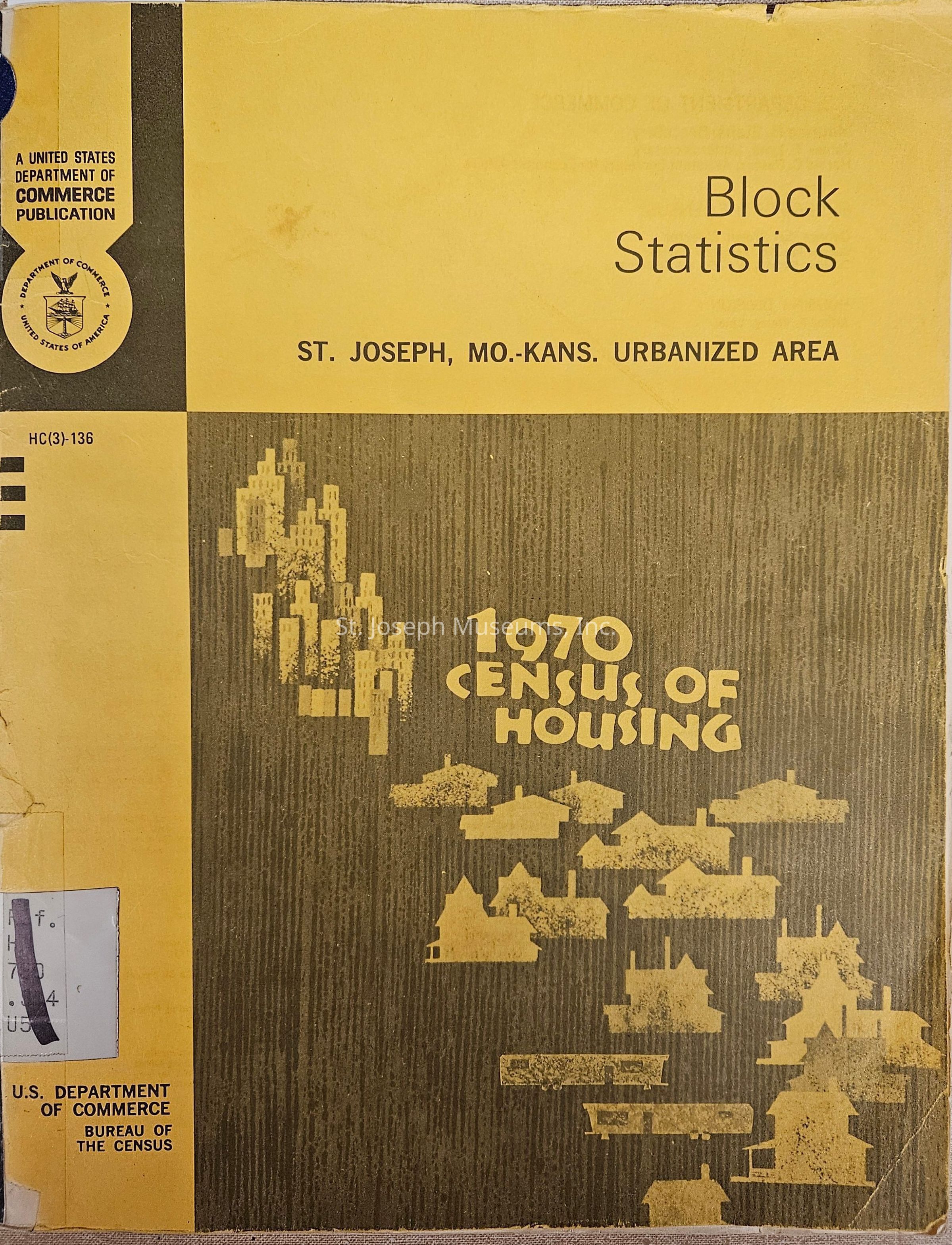 "1970 Census of Housing Block Statistics St. Joseph MO.-KANS. Urbanized Area" Issued October 1971. U.S. Department of Commerce, Bureau of the Census, and Housing Division. The cover is yellow and gray with a design of buildings and houses in a big block and a U.S. mail postage area on the back.