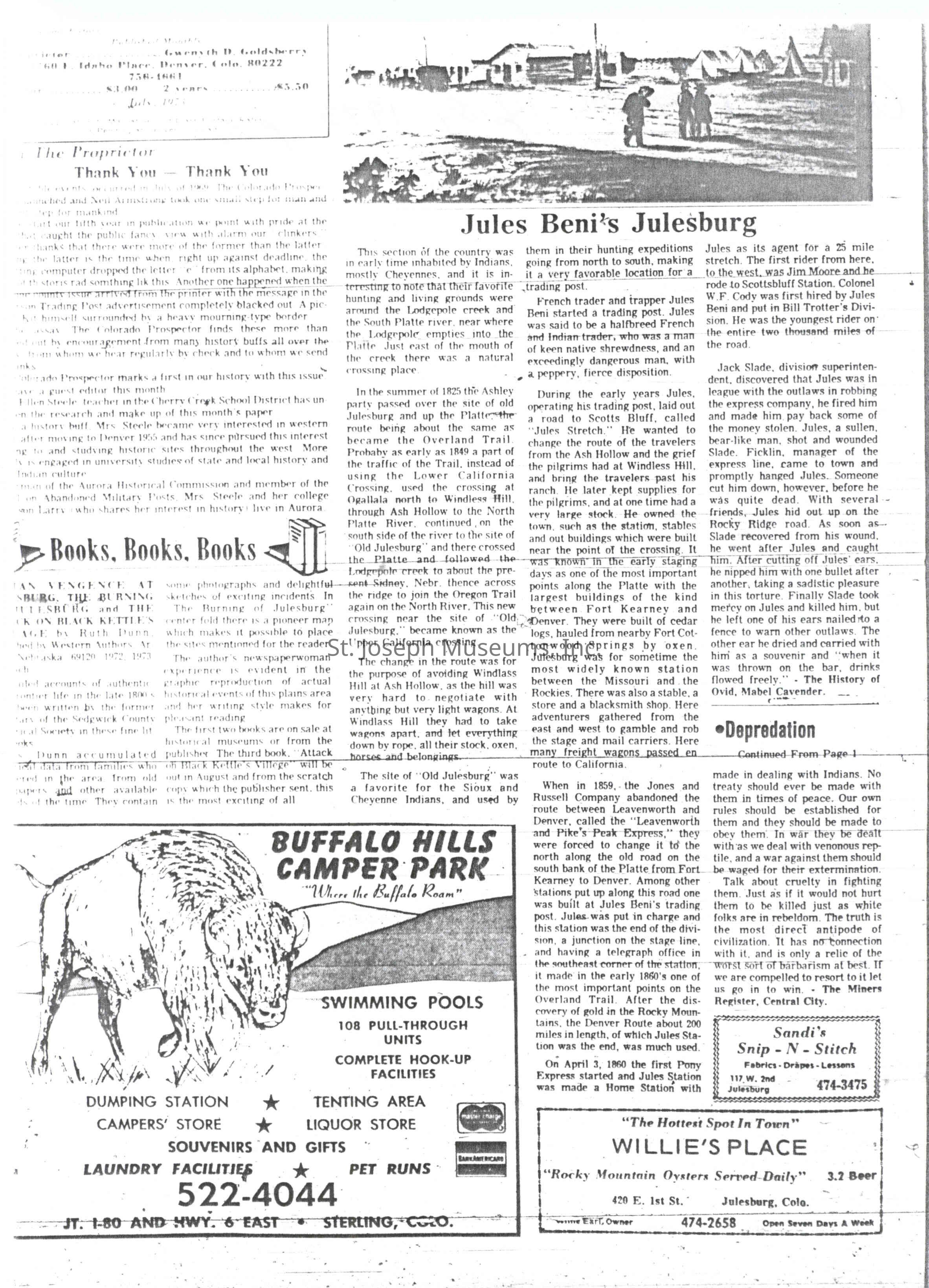 The image is a scanned newspaper page featuring multiple articles and advertisements. The main article "Jules Beni's Julesburg" discusses the history of a region once inhabited by Native Americans and eventually taken over by traders and settlers, including Jules Beni, a French trader who established a trading post there. The narrative details how the area became a significant stop on the trail to California and notes interactions with indigenous peoples as well as historical conflicts. Advertisements on the page promote "Buffalo Hills Camper Park" with facilities like swimming pools and laundry, alongside another ad for "Willie's Place" restaurant in Julesburg, Colorado.