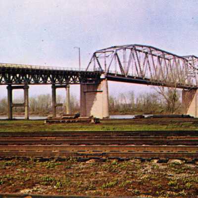 Pony Express Bridge Color Postcard, c. 1950. Color photo of truss bridge from Missouri River bank looking south, approaches on both east & west sides of river visible. Railroad tracks in foreground. undated, but view seems about 1950. unmailed. (Bridge was built in 1929 and demolished in 1984)