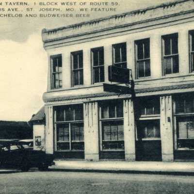 Hoof & Horn Tavern, 429 Illinois, Photo Postcard, c, 1930. "Hoof & Horn Tavern, 1 Block West of Route 59, 429 Illinois Ave., St. Joseph, MO. We Feature Michelob and Budweiser Beer." b/w Photo of front of building with 1930-style autos parked in front.