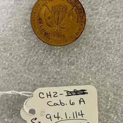 Coin/commemorative/metal/"Celebration of Ste. Genevieve, MO. Bicentennial - Under the Flags of 3 Nations 1735-1935"/other side shows 3 Indians-2 on shore & 1 in canoe, building in background