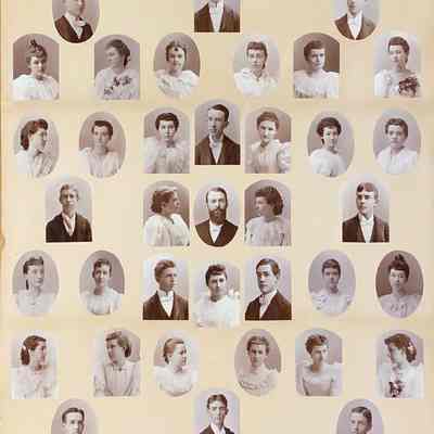 Graduation Photos, Unidentified, Found at Brown Transfer Co., c. 1900. Large piece cardboard - Individual photos of 37 girls, 11 boys, 1 man - All in formal dress - Possibly graduation photo - Found at Brown Transfer.Lexicon