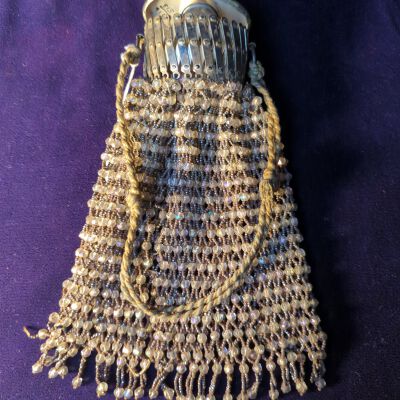 CUT STEEL AND GLASS BEAD/COLLAPSIBLE FRAME/COIN HOLDER ON INSIDE OF LID/CORD HANDLE/THERESA CAPP