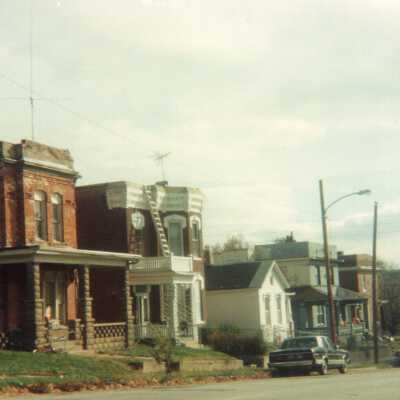 Ninth St. Residences. South of Angelique, Photo, c. 1980. Color snapshot of residences on east side of 9th Street, beginning with southeast corner with Angelique. The first 2-story red brick house no longer exists (2019), although the others still stand. The 2nd house is a 2-story brick home with patio porch on 2nd story. It sits beside a 1-story frame house, then two 2-story brick homes, probably duplexes.Collection