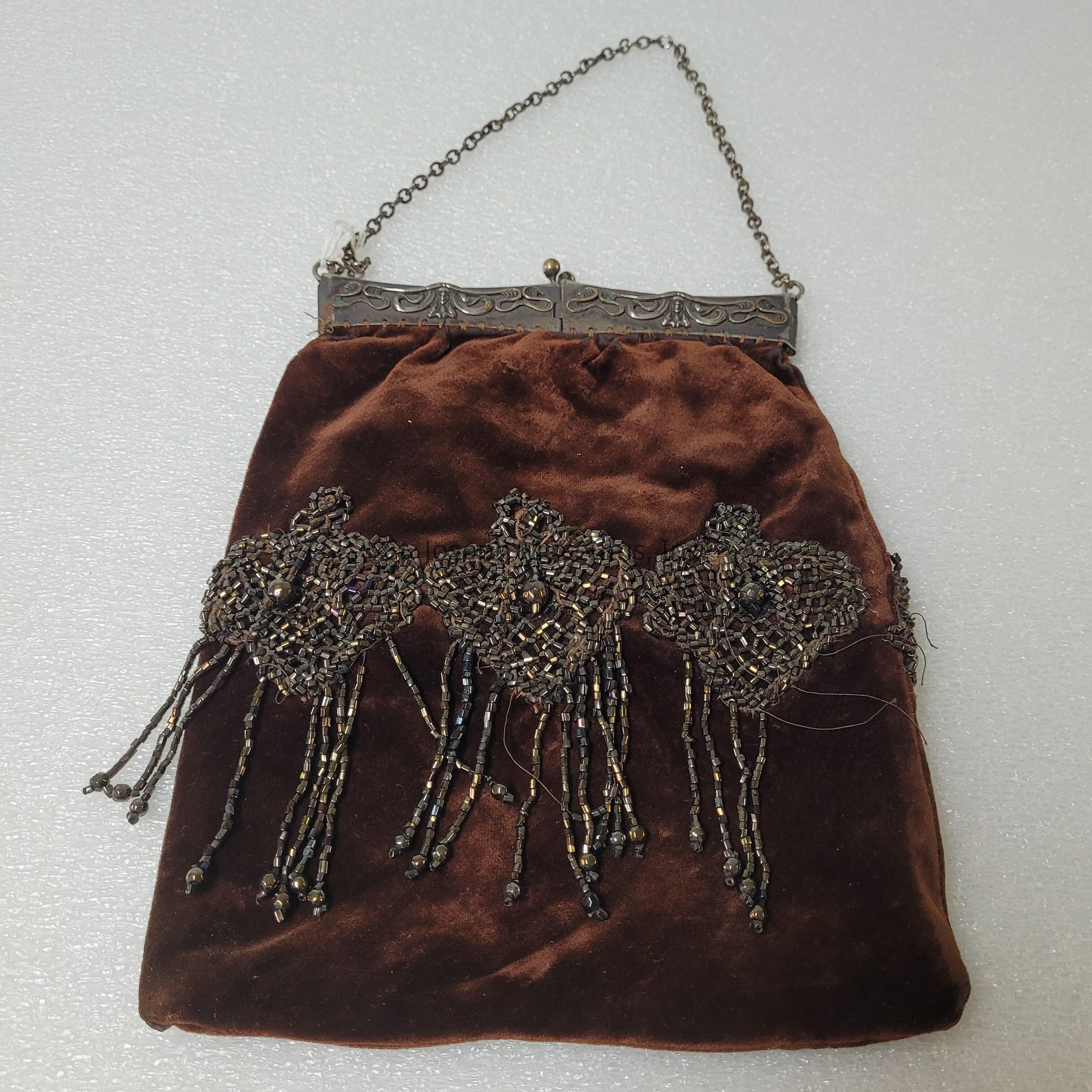 PURSE W/BEAD DECORATIONS/METAL CLOSURE & CHAIN HANDLE/TAN LINING W/2 POCKETS/ MRS. HELEN J. BOYER/ SOME BEADS MISSING