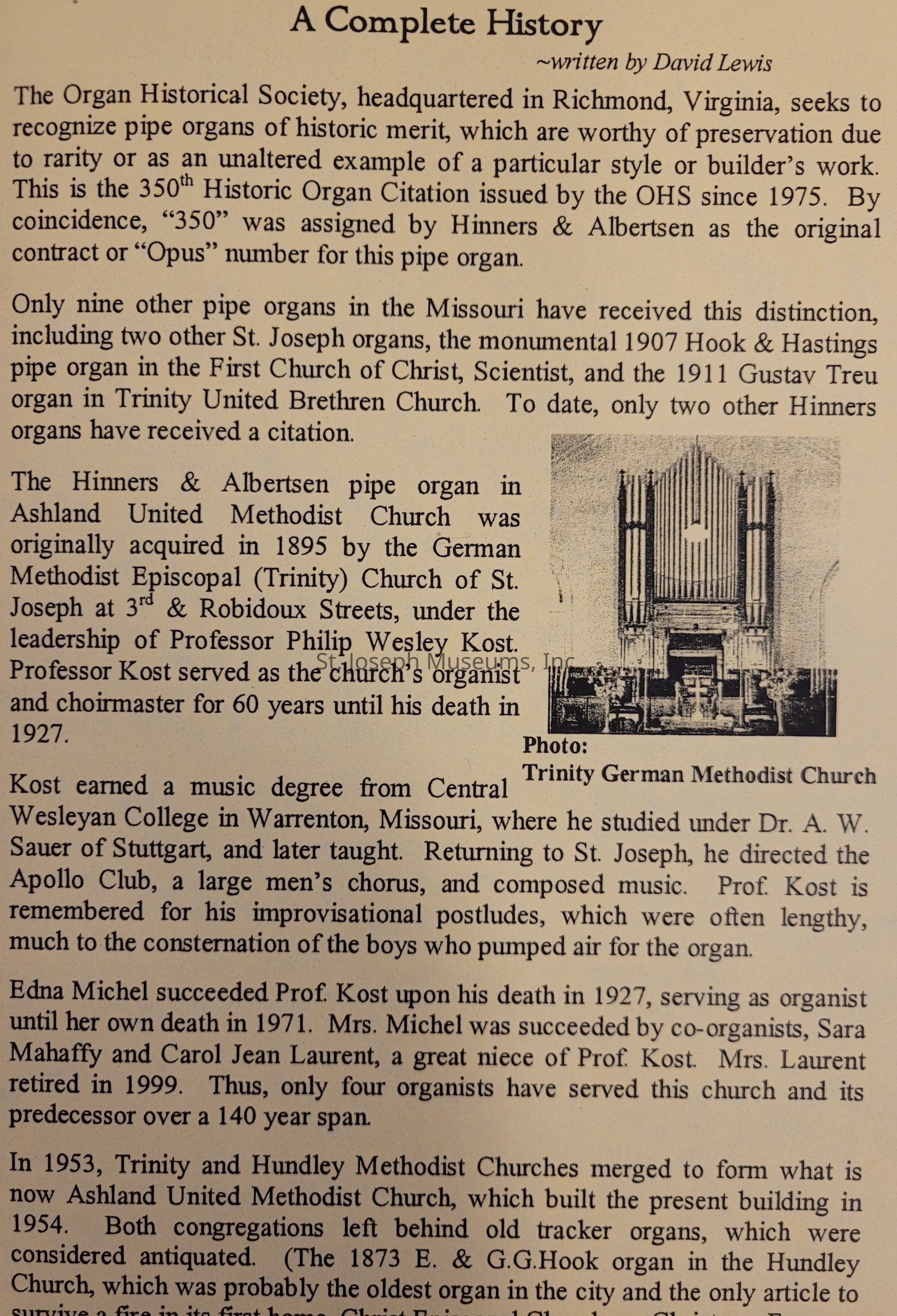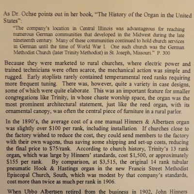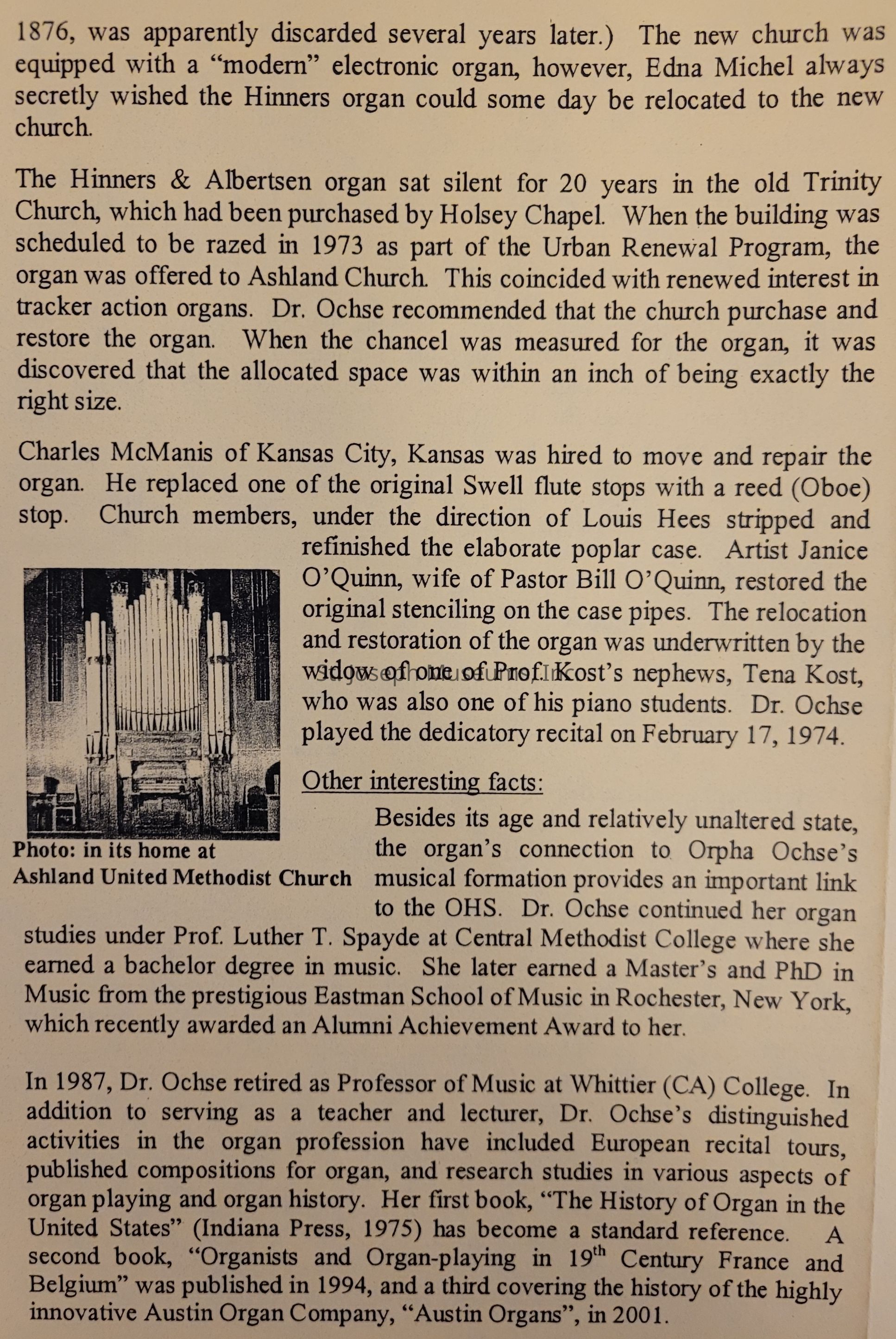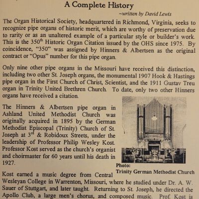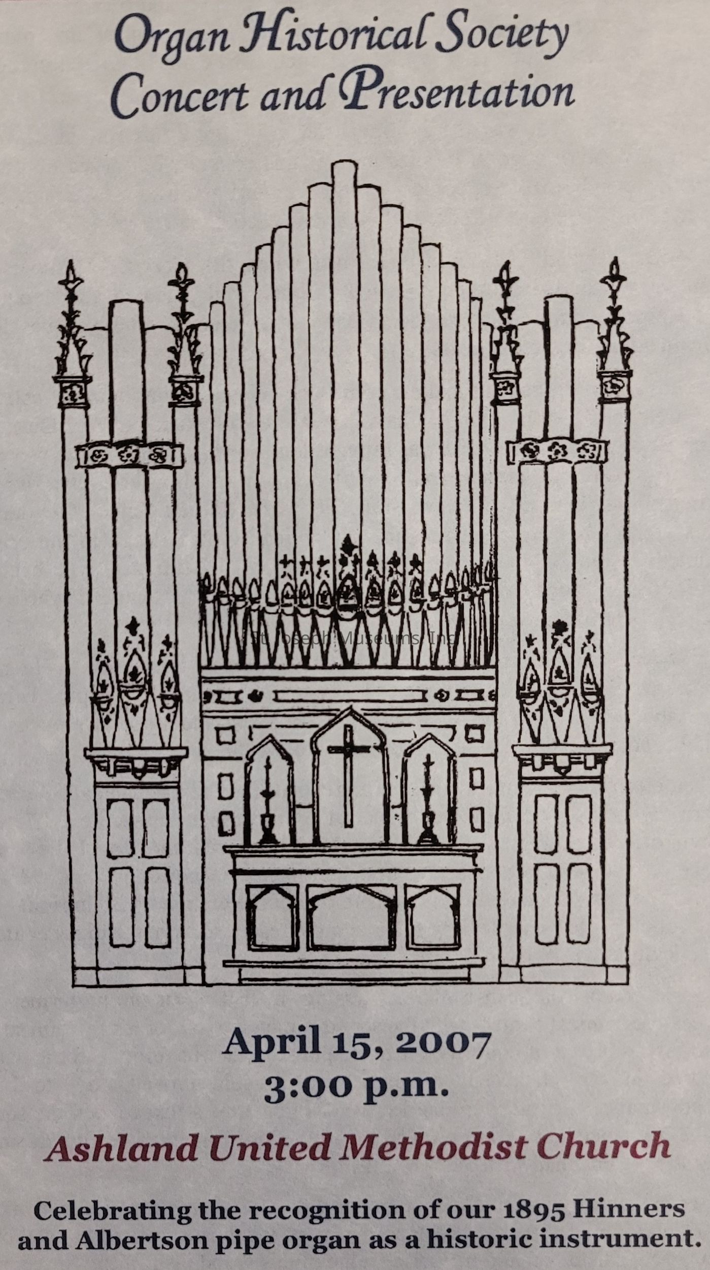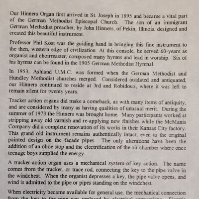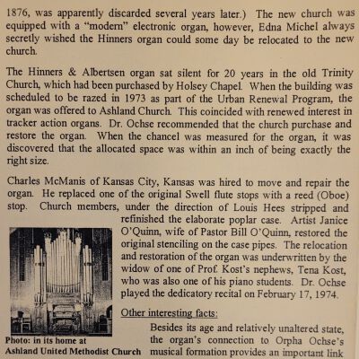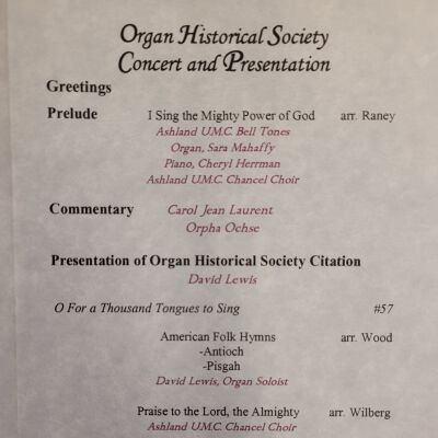 A pamphlet containing information on a concert and presentation for the Organ Historical Society hosted by Ashland United Methodist Church in honor of their organ being labeled a historic instrument.