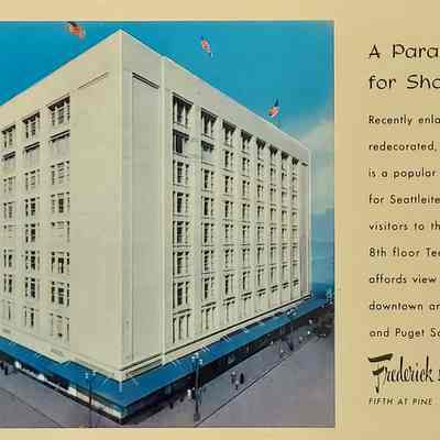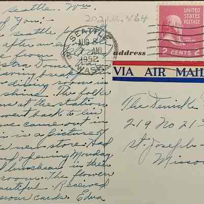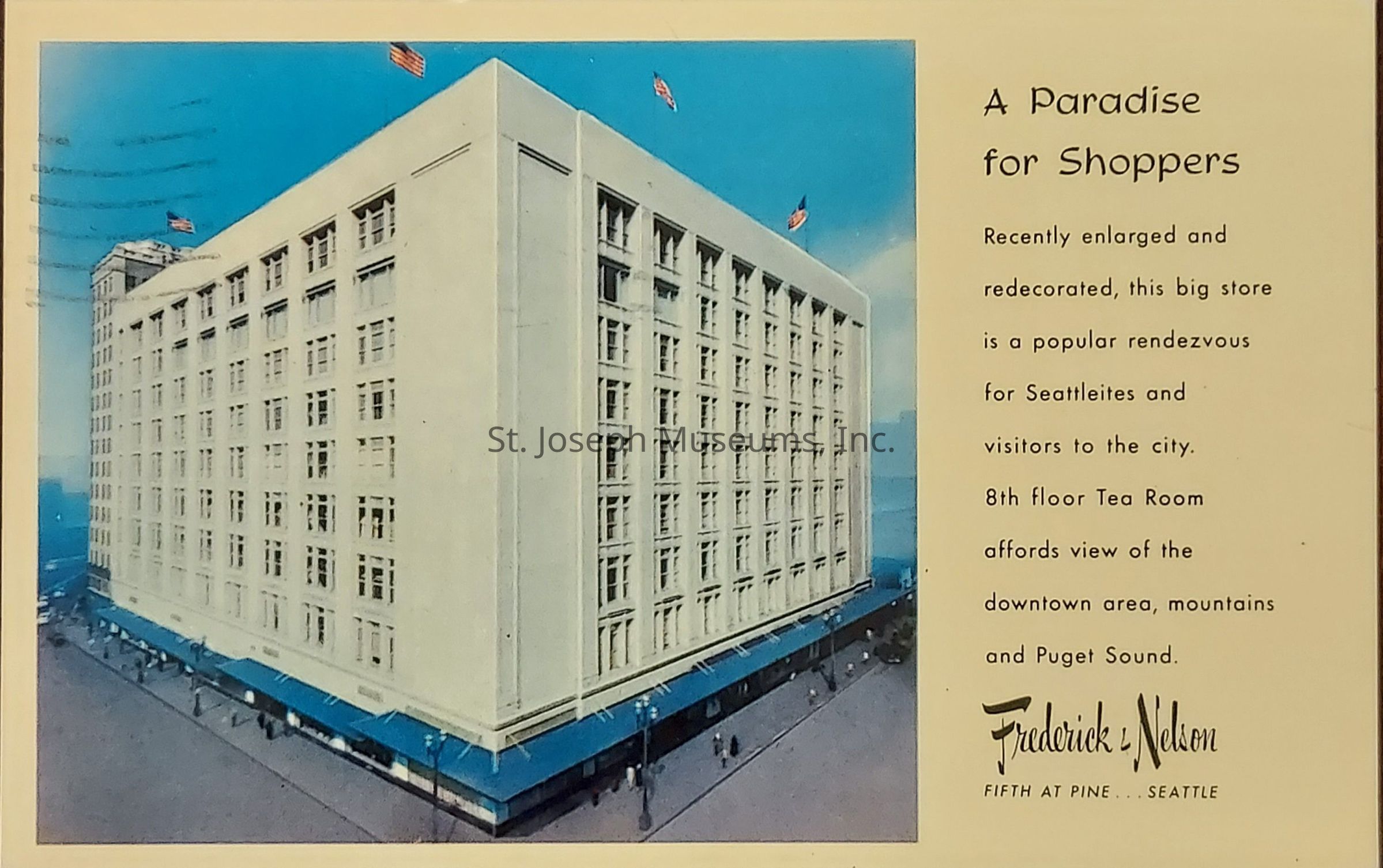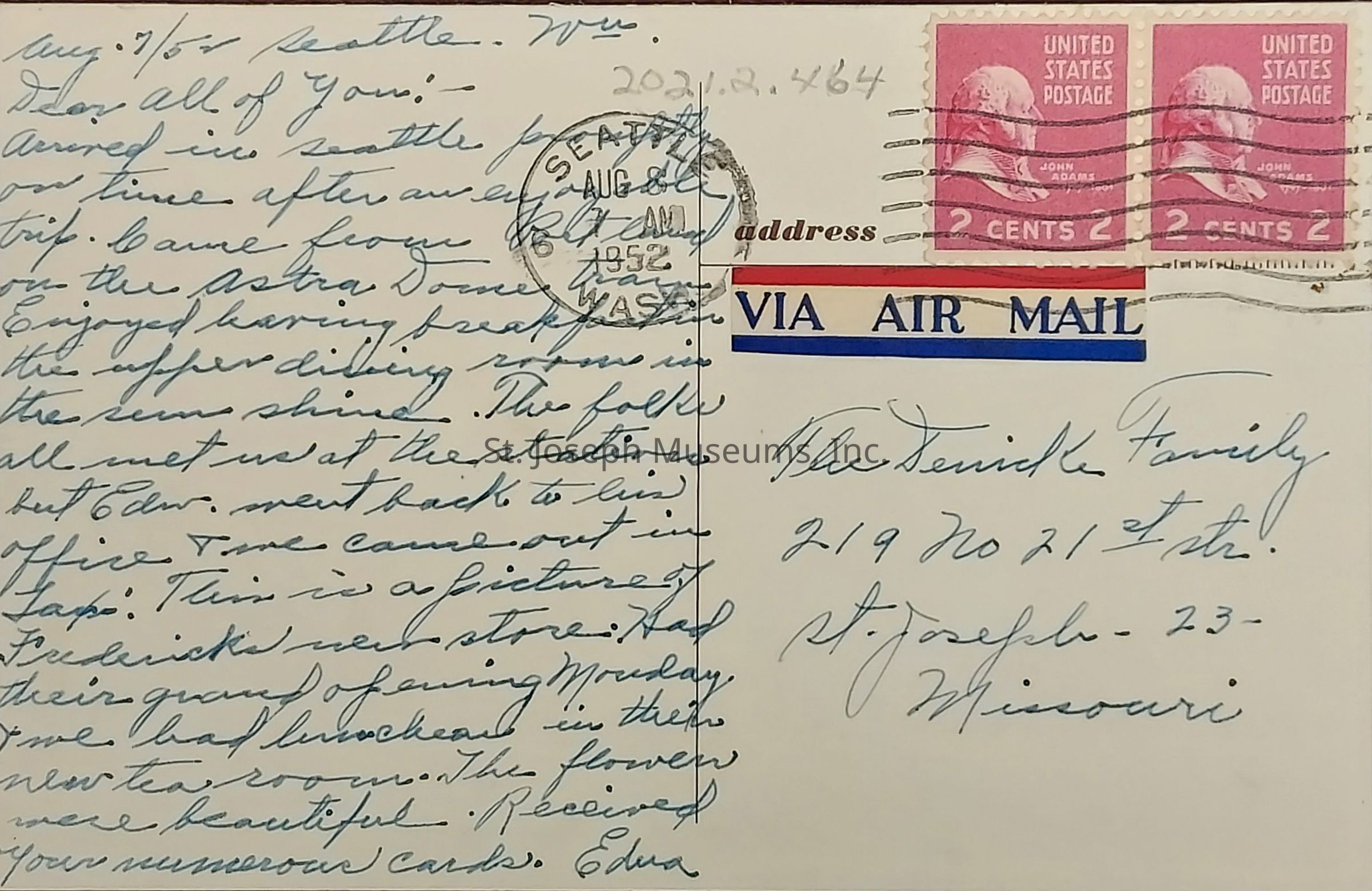 Handwritten postcard, from Edna to The Denicke Family, 219 North 21st, St. Joseph, Mo. Postmarked Aug 18, 1951, Seattle, Wash., postage Via Air Mail, 2-2¢ stamps. The front of the card is a colored picture of 'Frederick Nelson Department Store. A Paradise for Shoppers'.Context