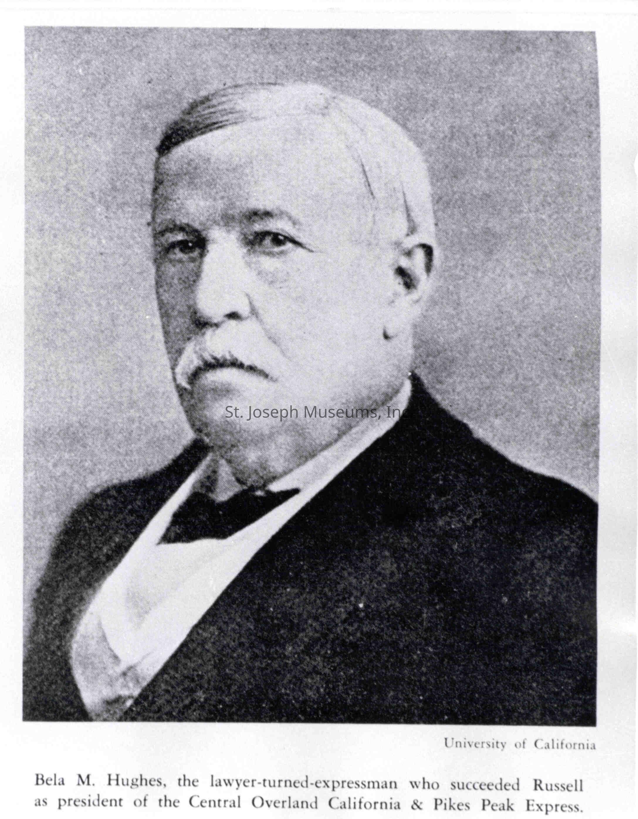Hughes, Bela M., President Central Overland California & Pikes Peak Express Company, Photo, c. 1861. Legend: "Bela M. Hughes, the lawyer-turned-expressman who succeeded Russell as president of the Central Overland California & Pikes Peak Express. b/w. Copy. from University of California. Rotund man with gray hair and mustached., Head view only. (older man than one in 95.1P.29)