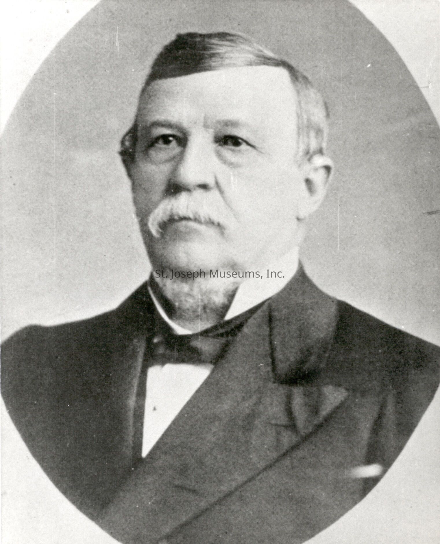 Hughes, Bela M., President Central Overland California & Pikes Peak Express Company, Photo, c. 1861. Hughes succeeded Wm. Russell as President. Photo of older man with graying hair "combed over", mustache and goatee, wearing formal suit. (younger than man in 95.1P.28) Oval, head shot, b/w. Copy
