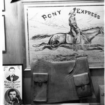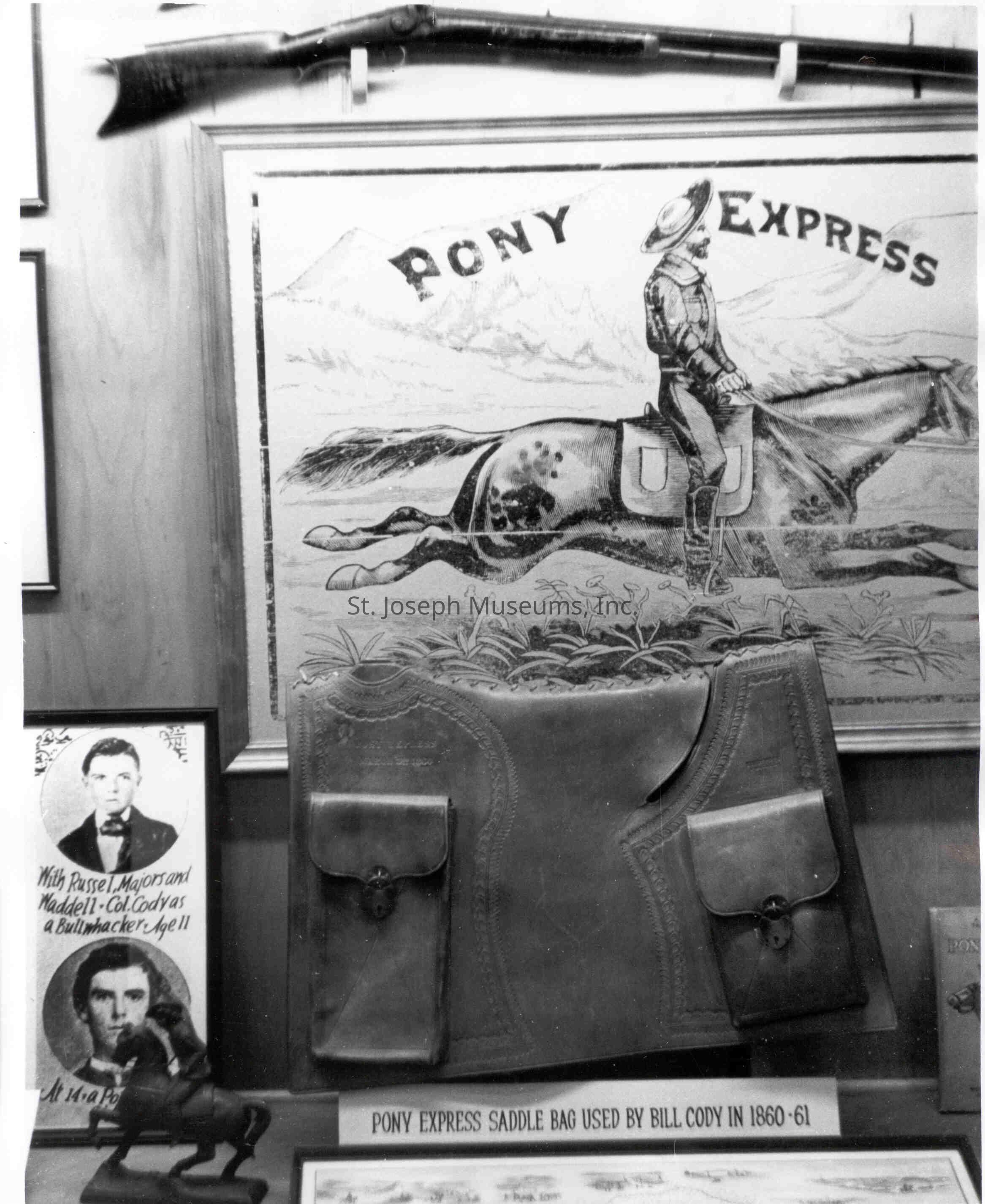Cody, William F.: Mochila Used by Him, Photo. Photo of an exhibit at the museum at the burial place of Cody in Lookout Mountain, Colorado. Leather mochila with Legend "Pony Express Saddle Bag Used by Bill Cody in 1860-61". Illustration of Pony rider behind saddle. b/w.